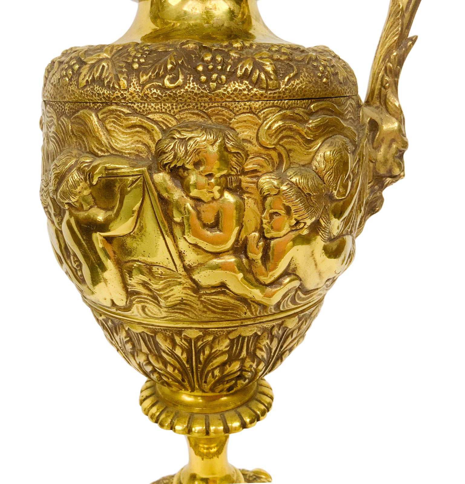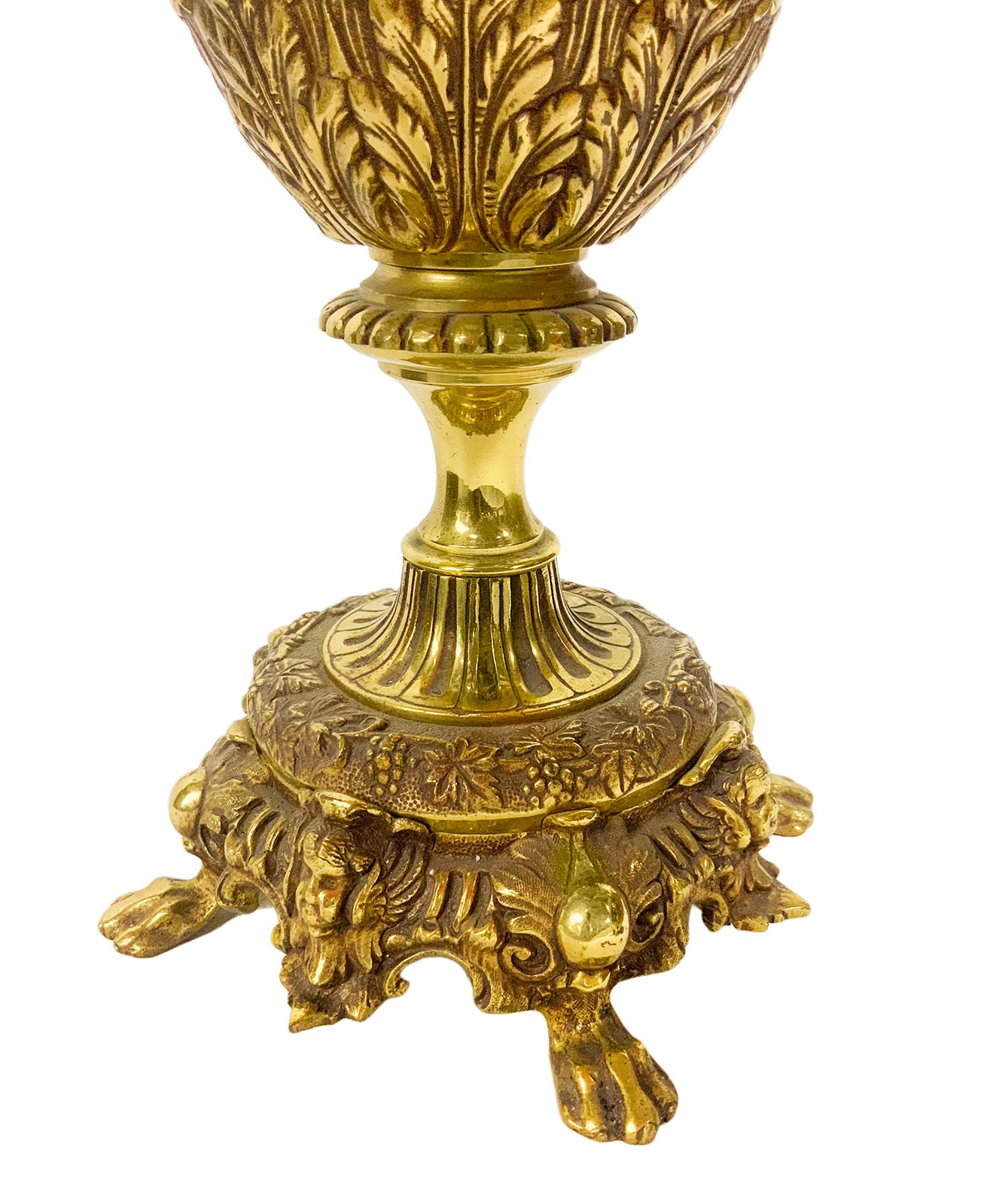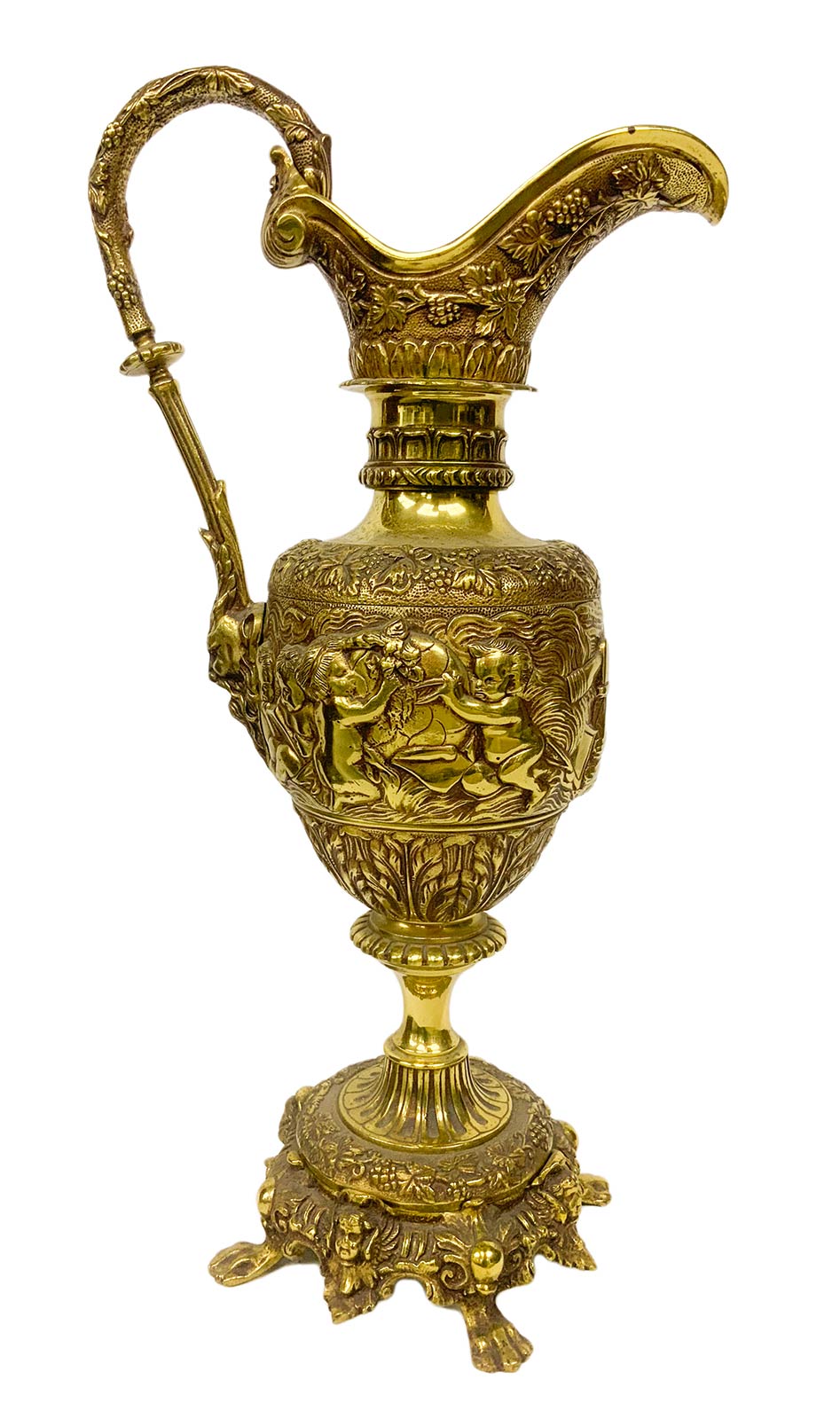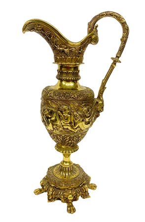 Vaso ad anfora in bronzo dorato con raffigurazioni a sbalzo di amorini riccamente decorato base a piedi felini. XIX secolo. H cm 50.