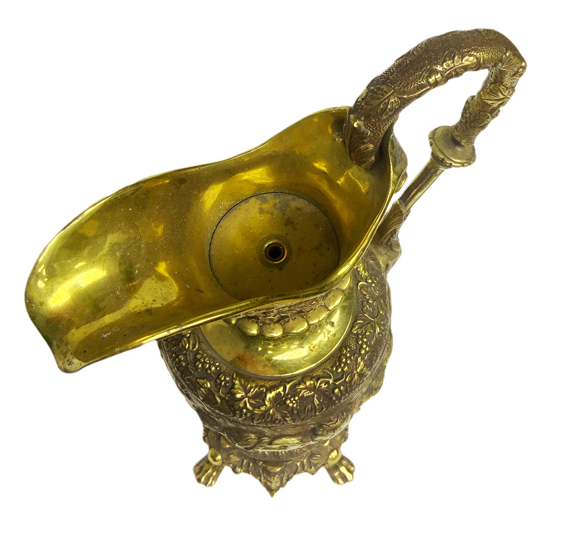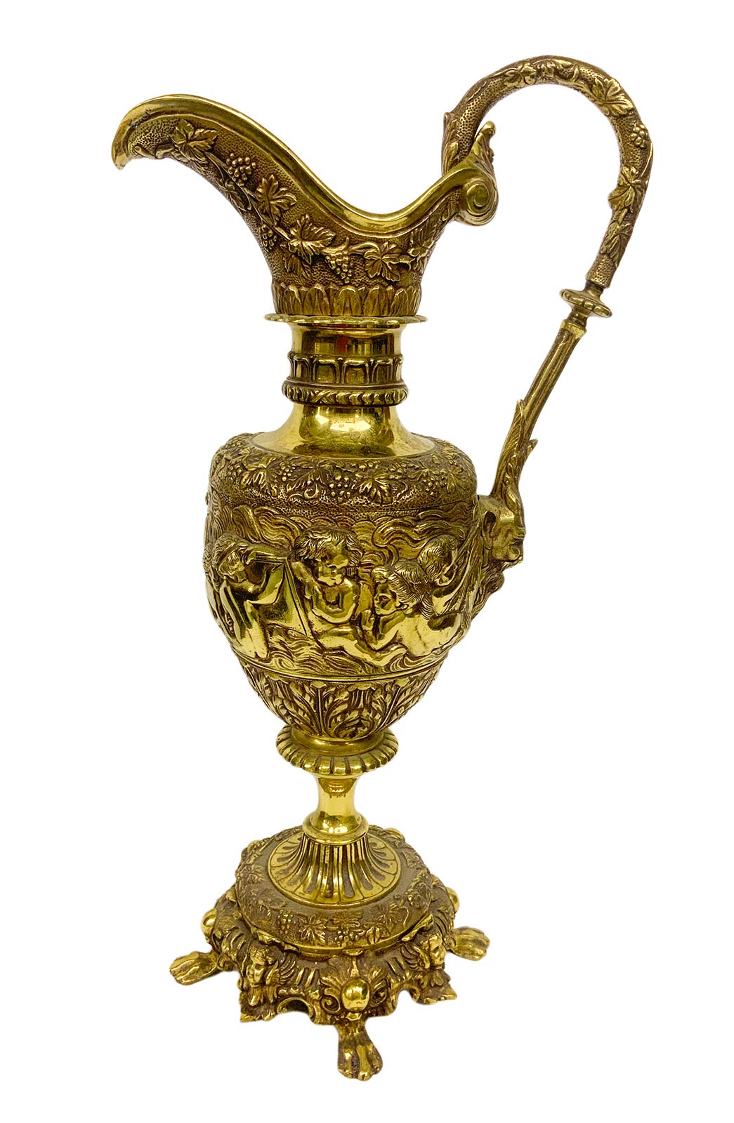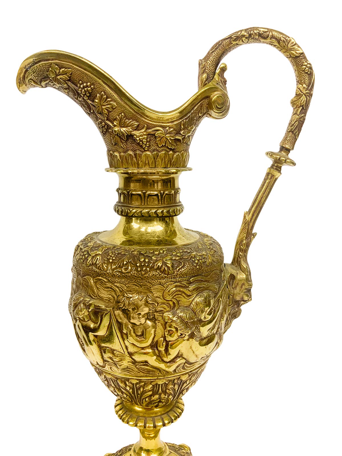 Vaso ad anfora in bronzo dorato con raffigurazioni a sbalzo di amorini riccamente decorato base a piedi felini. XIX secolo. H cm 50.