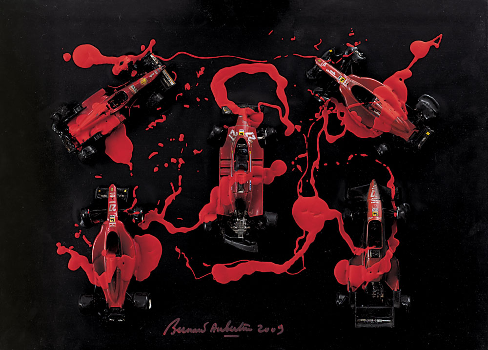 BERNARD AUBERTIN Fontenay aux Roses 1934 Ferrari 641/2, 2009 cinque modelli in metallo di automobili bruciati e applicati su tavola cm. 30x40, firma in basso al centro, dichiarazione d'autenticità dell'artista su foto, entro teca in plexiglass.