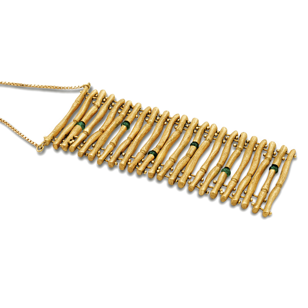 realizzata in oro giallo 18kt con pendente snodabile maglie a motivo di bamboo impreziosite da piccoli smeraldi, chiusura a gancio, firmata sulla targhetta, lunghezza 40 cm.