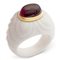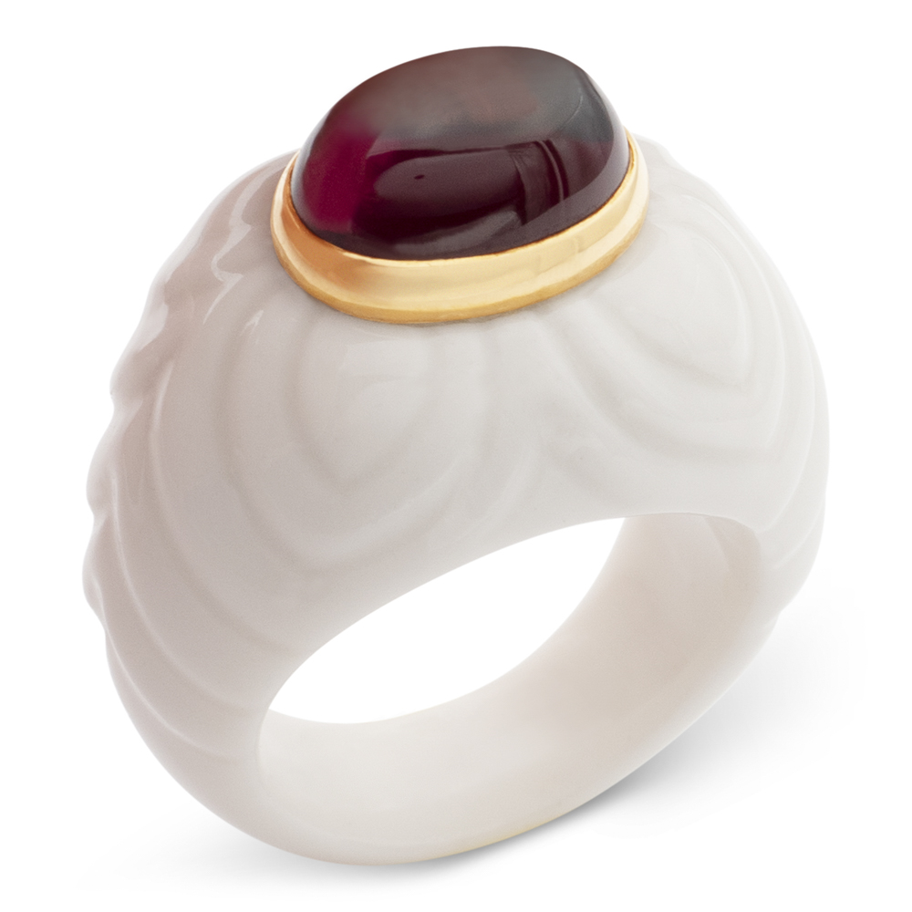 Bulgari collezione "Chandra", anellopeso 10,5 gr.in ceramica bianca e oro giallo 18kt con tormalina rosa taglio ovale cabochon, firmato all'interno del gambo, misura 11