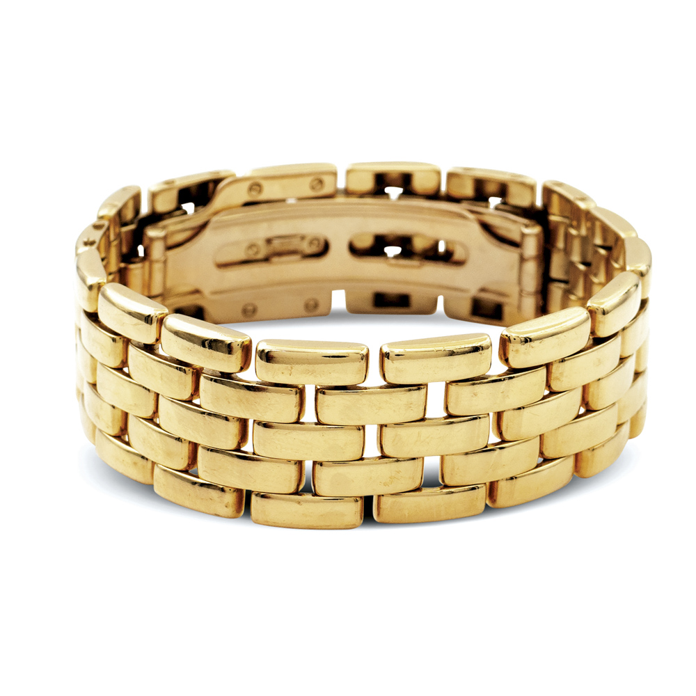 Cartier collezione" Maillon Panthere", braccialeanni 90peso 80 gr.in oro giallo 18kt maglie panthere a cinque file, firmato sulla chiusura deployante a scomparsa, diametro 6 cm.