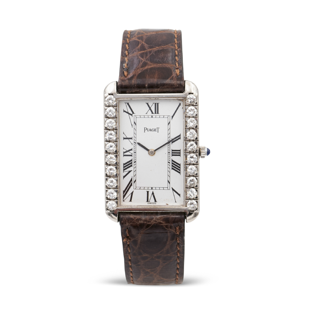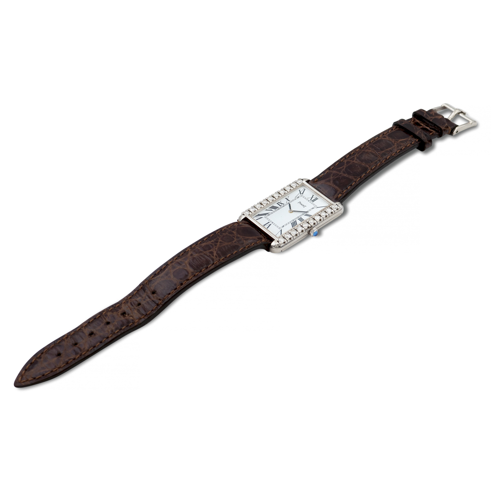 Piaget, orologio da donnaanni 70in oro bianco 18kt, cassa rettangolare 28x23 mm. impreziosita ai lati da diamanti taglio brillante ct 0,80 circa, ref. 9226 - 499970, vetro zaffiro, movimento meccanico a carica manuale, serie n,. 712169, cinturino con fibbia originale in oro bianco, cassa quadrante e movimento firmati