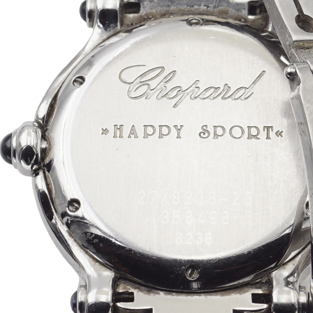 Chopard Happy Sport, orologio da polsoanni 2000.in acciaio, cassa tonda 34 mm. ai lati quattro zaffiri taglio cabochon, ref. 27/8238-23 358498 8236, quadrante nero con numeri romani, datario ore 6, all'interno sette diamanti taglio brillante ct 0,35, corona zaffiro, vetro zaffiro, movimento al quarzo, bracciale originale in acciaio con chiusura deployante, cassa, quadrante e movimento firmati