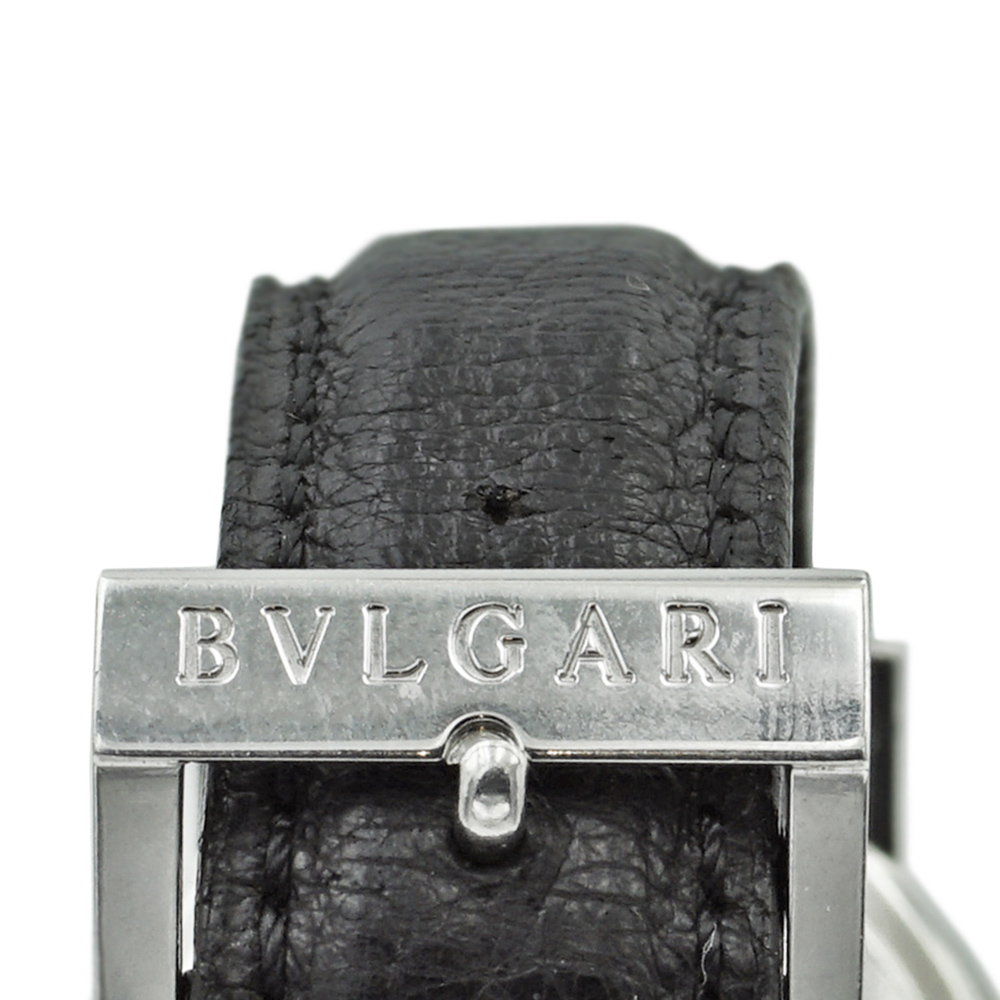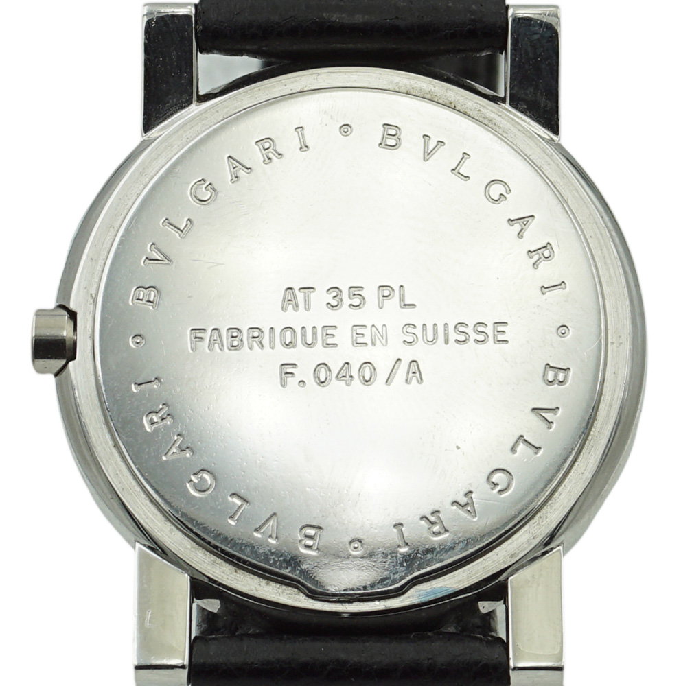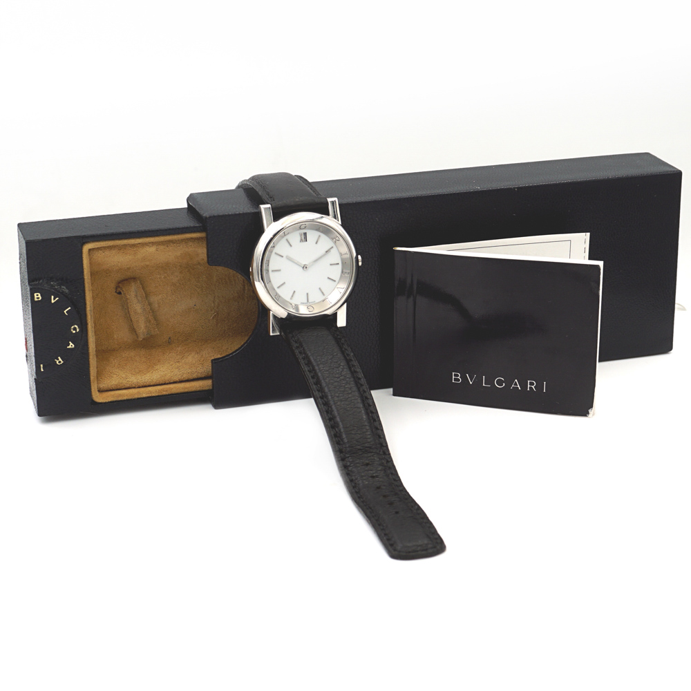 in platino, cassa tonda 35 mm. ref. AT35PL - F.040/A, quadrante bianco con indici e numeri romani, vetro zaffiro, movimento al quarzo, cinturino in pelle con fibbia originale Bulgari in platino, cassa, quadrante e movimento firmati