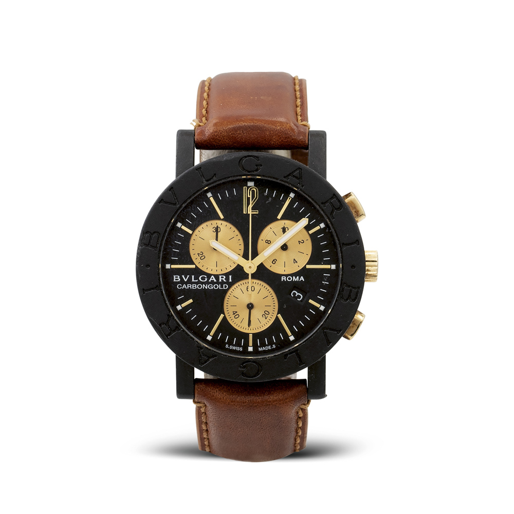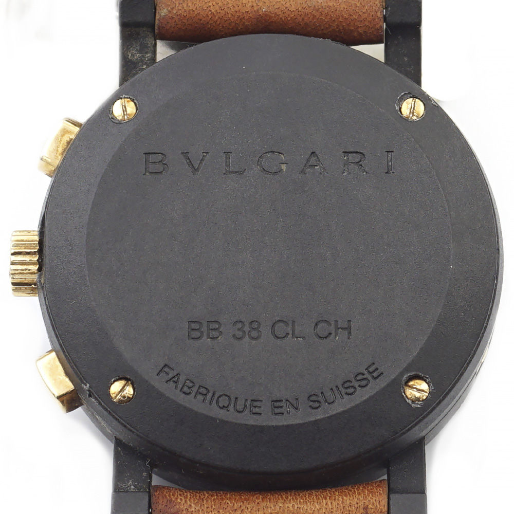 Bulgari Carbongold Roma, orologio cronografo da polsoanni 2000cronografo tricompax, in carbonio e oro giallo 18kt, cassa tonda 38 mm. ref. BB 38 CL CH - B56/999, quadrante nero con indici dorati, tre contatori ausiliari per il cronografo, datario ore 4, vetro zaffiro, lunetta in carbonio, movimento al quarzo, calibro Esa 251471, cinturino in pelle, cassa, quadrante e movimento firmati