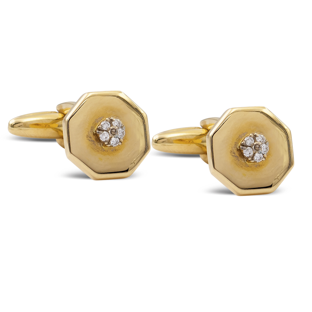 Gemelli di forma ottagonale in oro giallo 18ktpeso 6,7 gr.centrati da due diamanti taglio brillante ct 0,16 circa