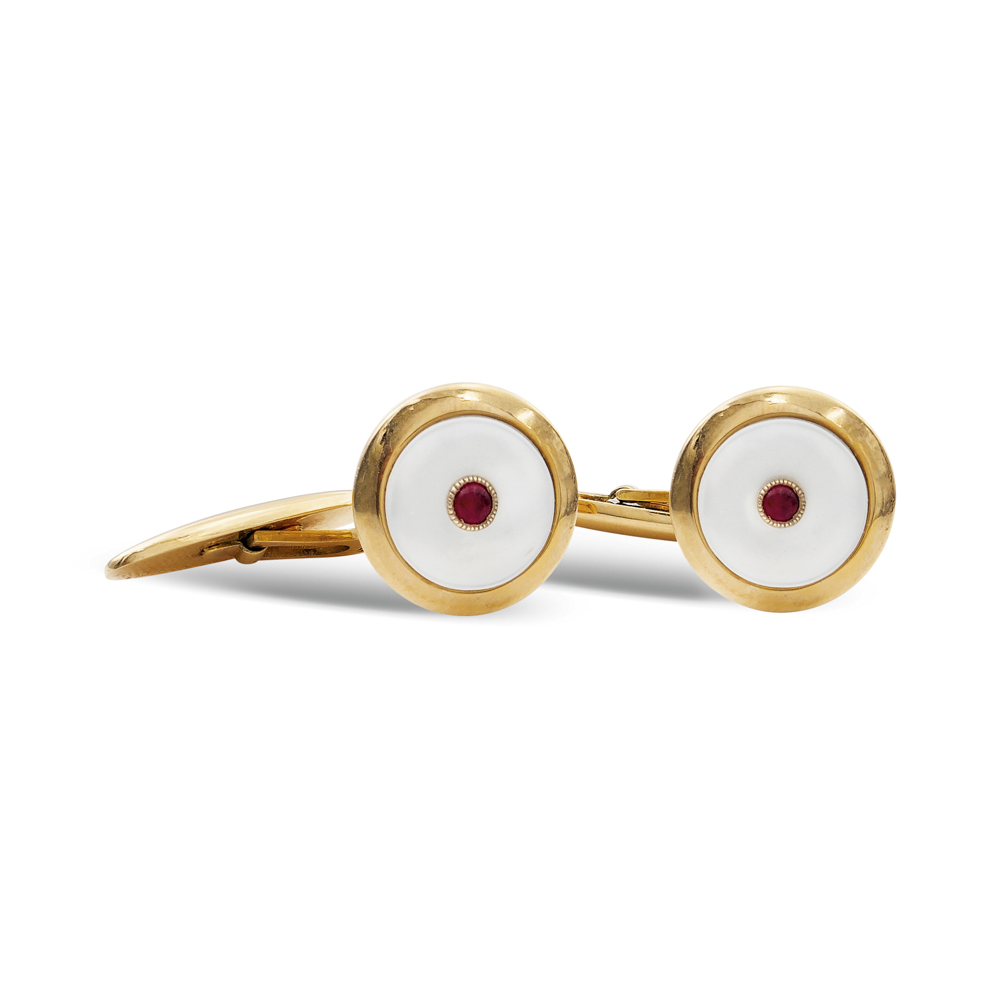 Gemelli di forma circolare in oro giallo 18kt e madreperlabolli Francia, anni 40/50peso 5 gr.centrata da due rubini taglio cabochon