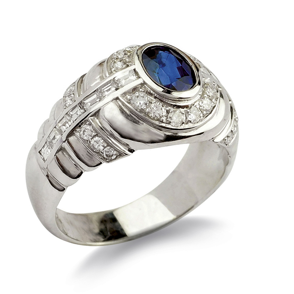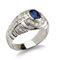 Anello in oro bianco 18kt con zaffiro ovale e diamantipeso 7,8 gr.zaffiro ct 0,80 circa e diamanti taglio brillante ct 0,50 circa, misura 14