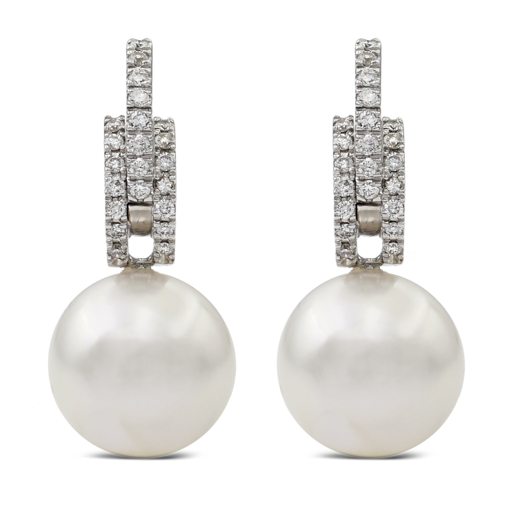 Orecchini in oro bianco 18kt e perle South Seapeso 14,5 gr.di 14,5 mm. circa sormontati da diamanti taglio brillante ct 0,70 circa