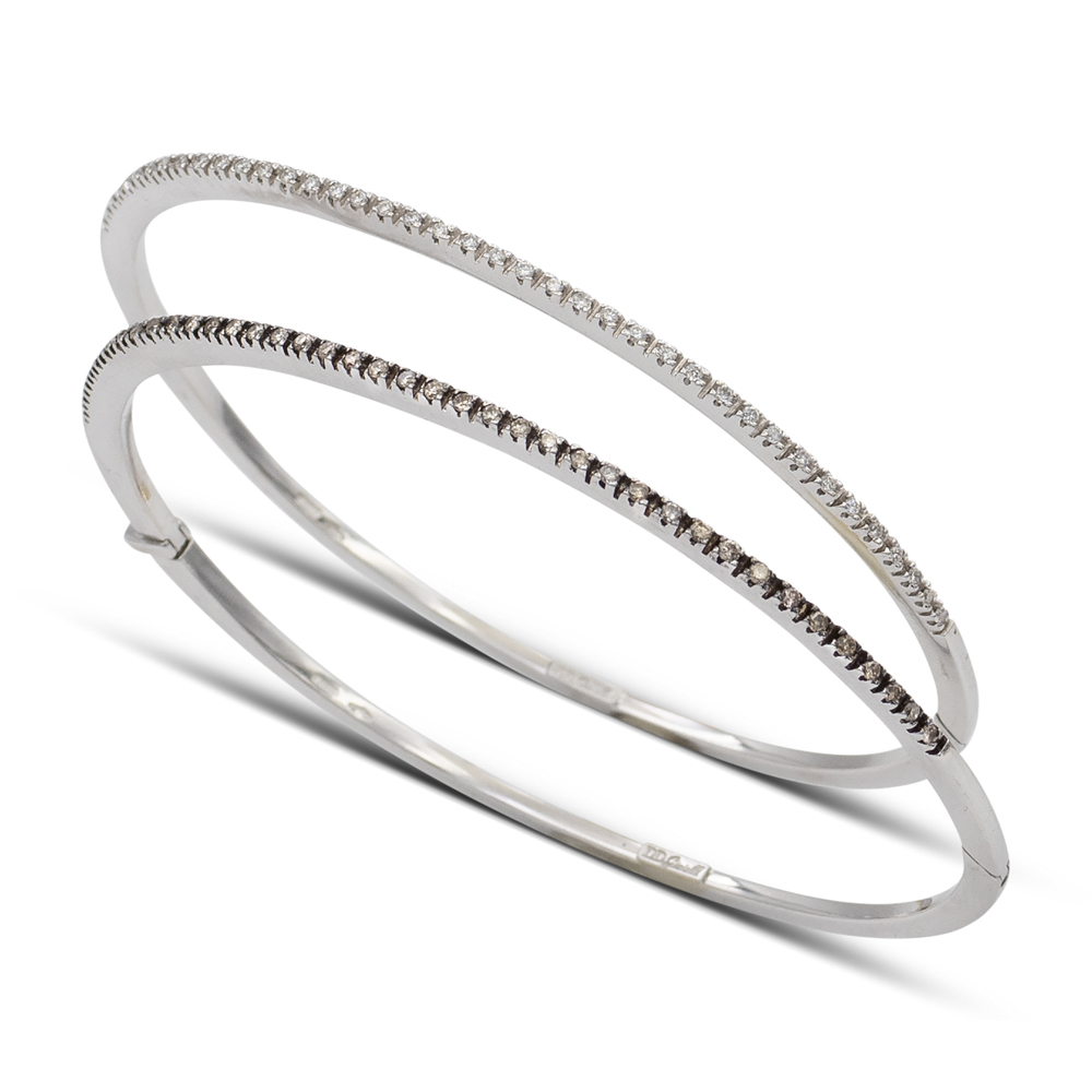 Due bracciali a manetta in oro bianco 18kt e diamantipeso 17,6 gr.taglio huit-huit incolore e brown ct 0,80 circa, diametro 5,5 cm.