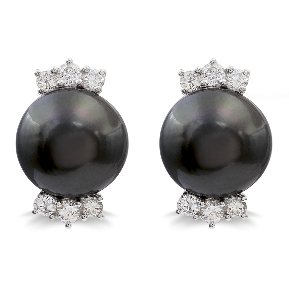 Orecchini a lobo in oro bianco 18kt e perle Tahitipeso 13,9 gr.13,5 mm. e sei diamanti taglio brillante ct 1 circa