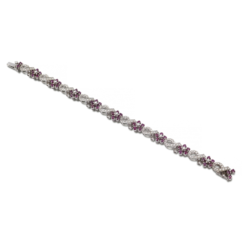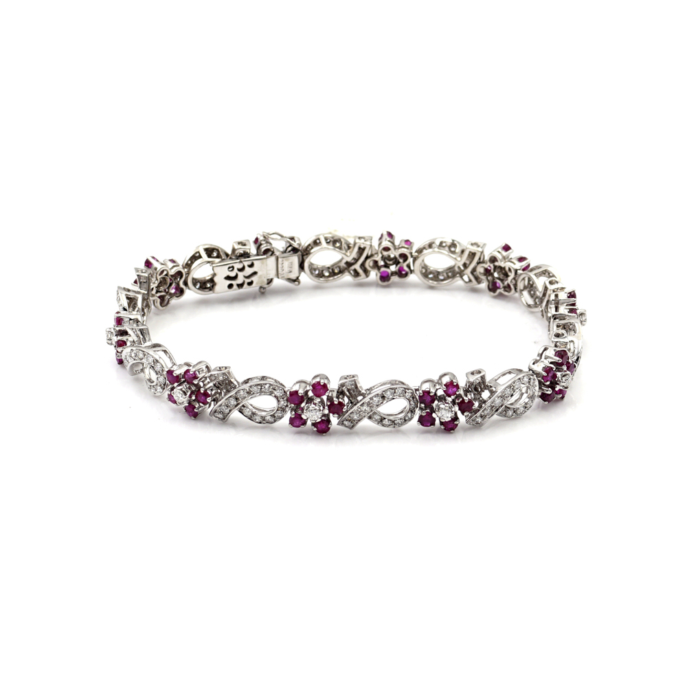 Bracciale a motivo floreale in oro bianco 18ktpeso 20,7 gr.realizzato con diamanti taglio brillante ct 2 circa alternati da rubini tondi ct 1 circa, chiusura a scomparsa, lunghezza 18 cm.