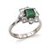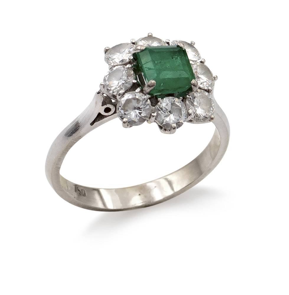 Anello in oro bianco 18kt con smeraldoAnni 50/60peso 2,6 gr.taglio carré ct 0,40 circa contornato da diamanti taglio brillante ct 0,25 circa, misura 7