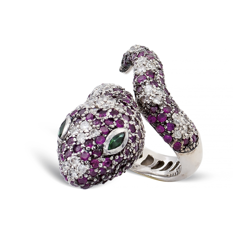 Anello a serpente in argento con rubini e diamantipeso 17 gr.taglio brillante ct 0,70 circa, occhi con smeraldi taglio marquise, firmato Petochi sul gambo, misura 11