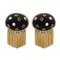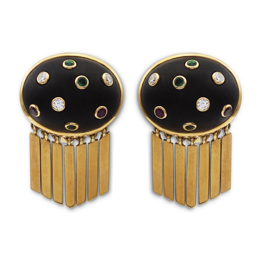 Orecchini in oro giallo 18kt e legnopeso 23,3 gr.impreziositi da diamanti, rubini e zaffiri incastonati su oro giallo e frange pendenti