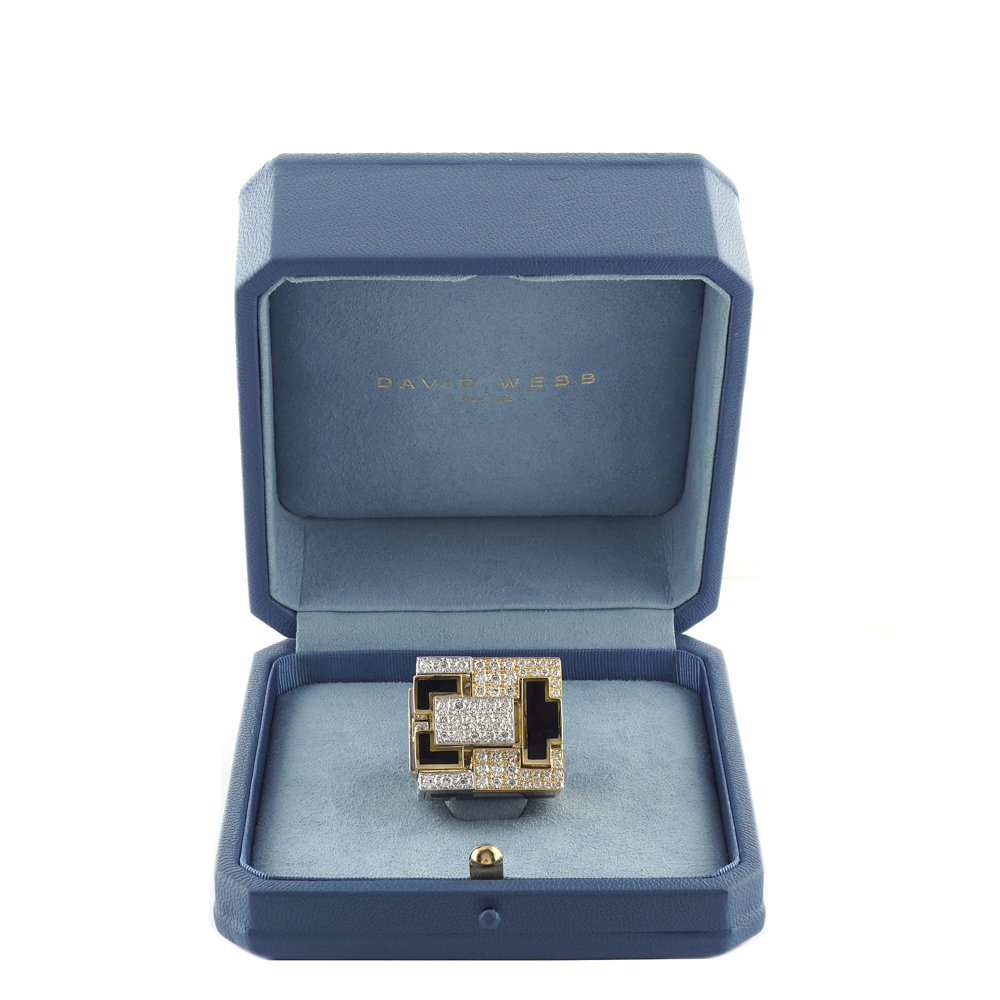David Webb, anello scultura "Mega Cubist Ring"peso 65 gr.montato in oro giallo 18kt e platino con stesura di smalto nero e diamanti taglio brillante ct 4,66 misura 13