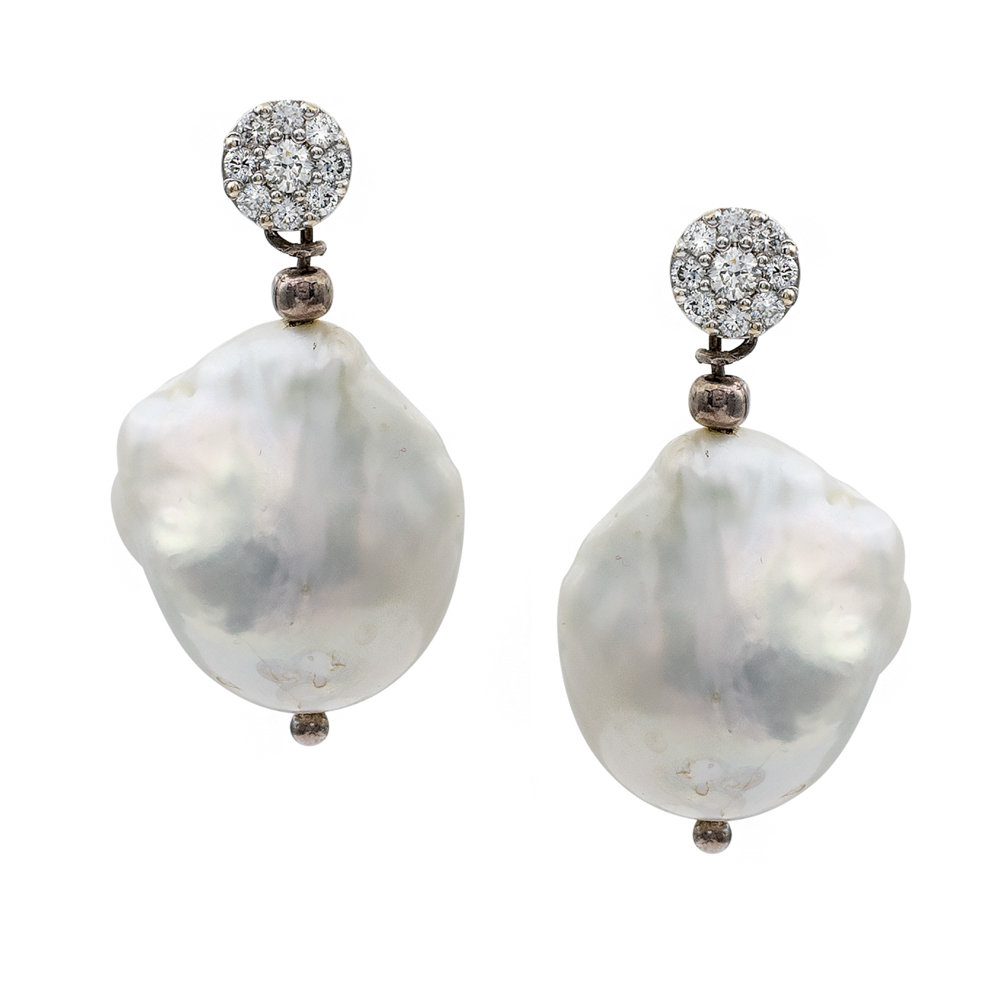 Orecchini in oro bianco 18kt e perle South Sea barocchepeso 11 gr.pendenti e sormontate da diamanti taglio brillante ct 0,50 circa