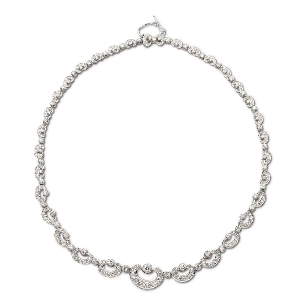 Collier in oro bianco 18kt e diamantianni 50/60peso 34,6 gr.taglio brillante ct 8 circa, chiusura a scomparsa, lunghezza 40 cm.