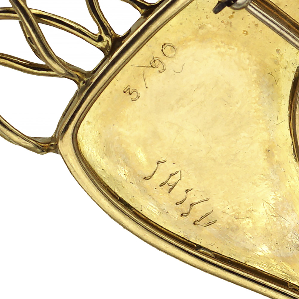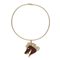 Aligi Sassu, spilla pendente "Destriero"Milano 1912 - Pollença 2000peso 53 gr.opera realizzata a foggia di testa di cavallo in oro giallo 18kt e smalto rosso, esemplare n.3/90, firmata e numerata sul retro, completa di collier semirigido in oro giallo, diametro 13,5 cm.