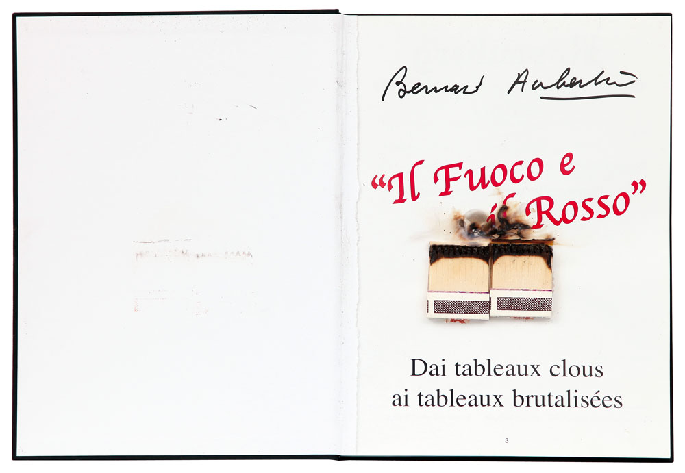 BERNARD AUBERTIN Fontenay aux Roses 1934 Senza titolo fiammiferi e combustioni in prima pagina su catalogo "Bernard Aubertin, Il fuoco e il rosso", edizioni Rosemberg cm. 31x23, firma in alto, attestato d'autenticità e provenienza della Società di Mano in Mano (MI) allegata.