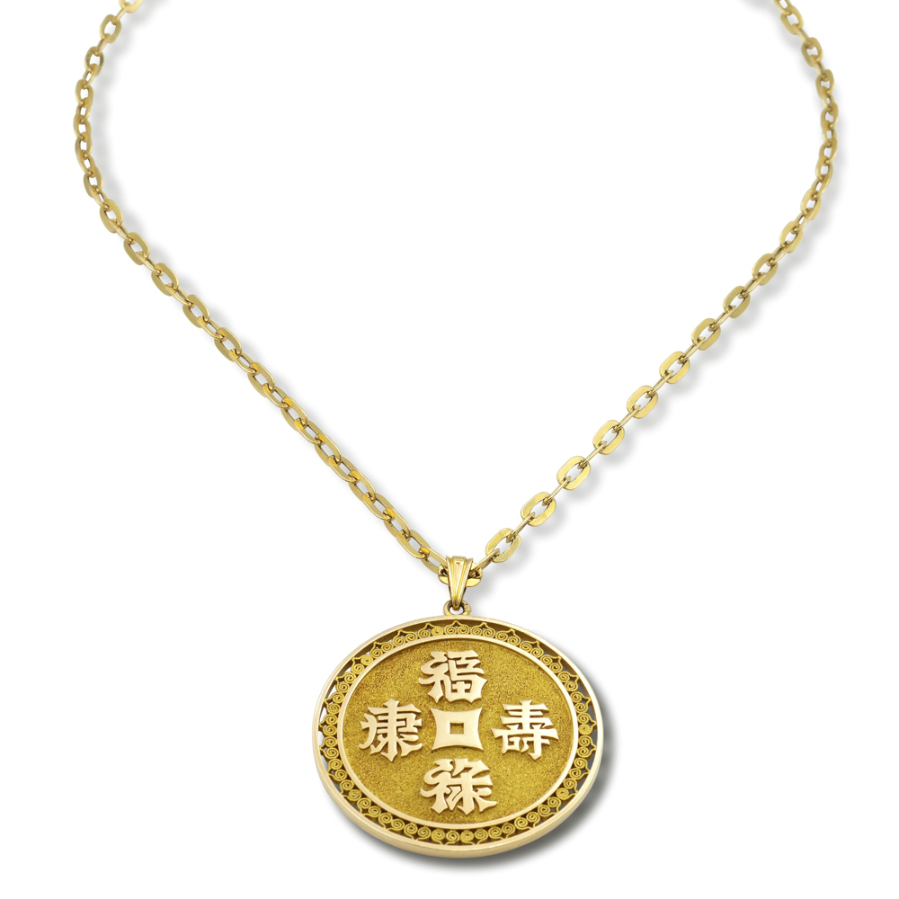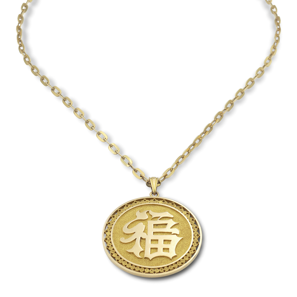 Pendente circolare in oro giallo 18ktpeso 42 gr.inciso avanti e retro con monogrammi cinesi, completo di catena in oro giallo 18kt, lunghezza 50 cm.