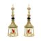 Orecchini pendenti in oro giallo 14 kt e smaltopeso 16,4 gr.realizzati a foggia di gabbietta con uccellino in corallo e nido con perle all'interno, sormontata da una stella e un cuore in oro e diamanti taglio brillante ct 0,35 circa alternate da onice nero e peridoto