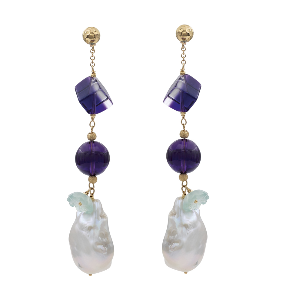 Orecchini pendenti in oro giallo 18kt e ametistepeso 28,8 gr.tagliate a cubo e sfera alternate da piccole sfere in oro giallo brillantinato, terminali con perle South Sea barocche sormontate da fiori di acquamarina