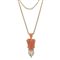 Pendente in corallo con figura centrale raffigurante una baccanteSicilia, XIX Sec.peso 21 gr.scolpito ad altorilievo e pendenti in oro con diamanti taglio brillante antico e perline, uno mancante, completo di collana in oro giallo 18kt, lunghezza 40 cm.