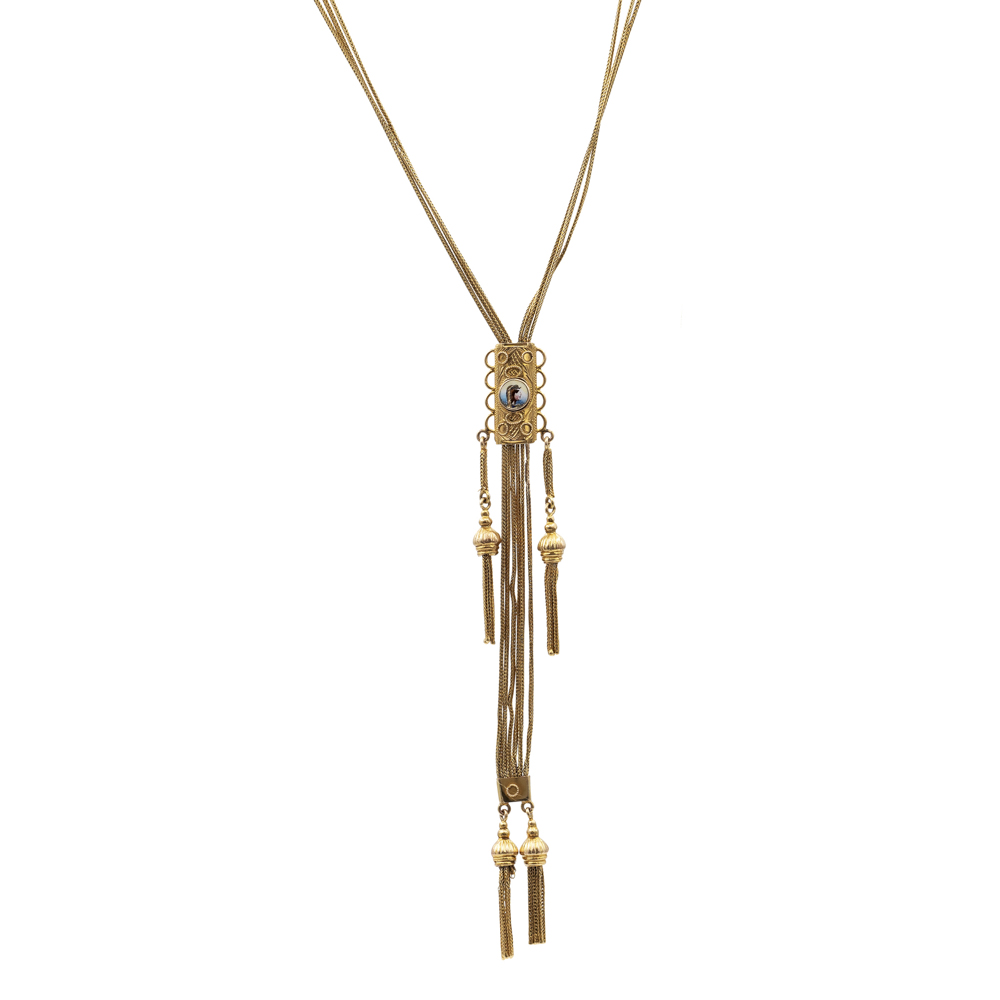 Saliscendi in oro giallo 9ktprimi '900peso 44 gr.maglia a spina di pesce, elemento centrale scorrevole decorato con miniatura in smalto raff. Cleopatra e nappine pendenti, lievi difetti, lunghezza 114 cm.