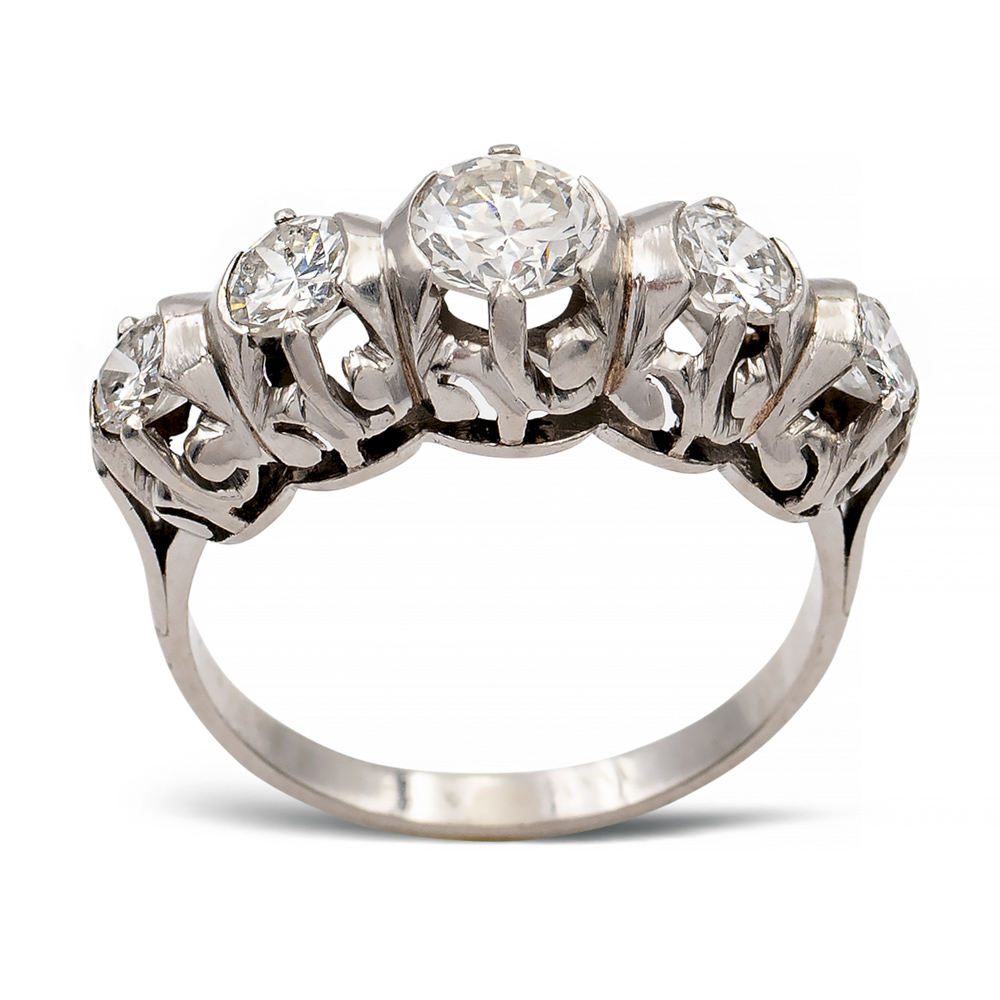 Anello riviere in platino con cinque diamantianni 30/40peso 6,3 gr.taglio brillante antico ct 1,40 circa, montato in oro bianco, misura 19