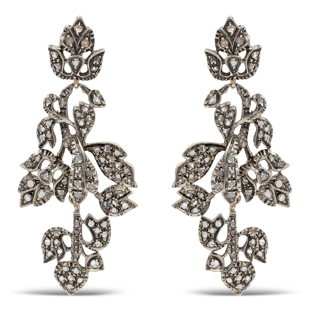 Orecchini pendenti a motivo florealeprimi '900peso 21,4 gr.in argento e oro giallo 9kt con rose di diamante