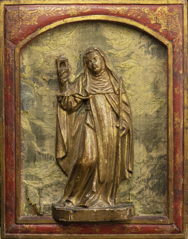 H. cm 33x16x4 altorilievo in legno applicato su stoffa e inserito in cornice lignea cm 45x35