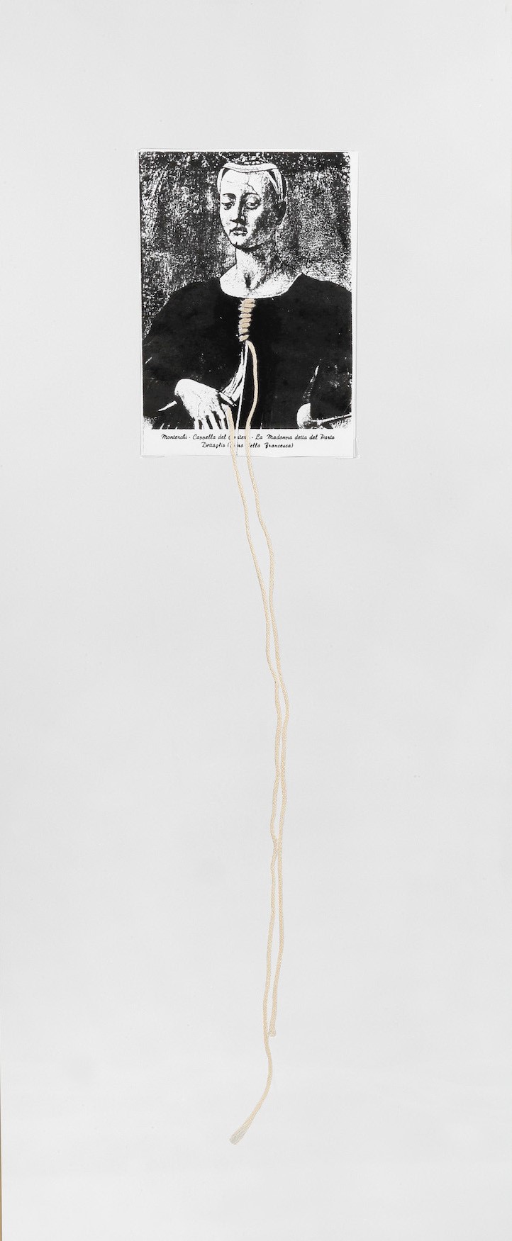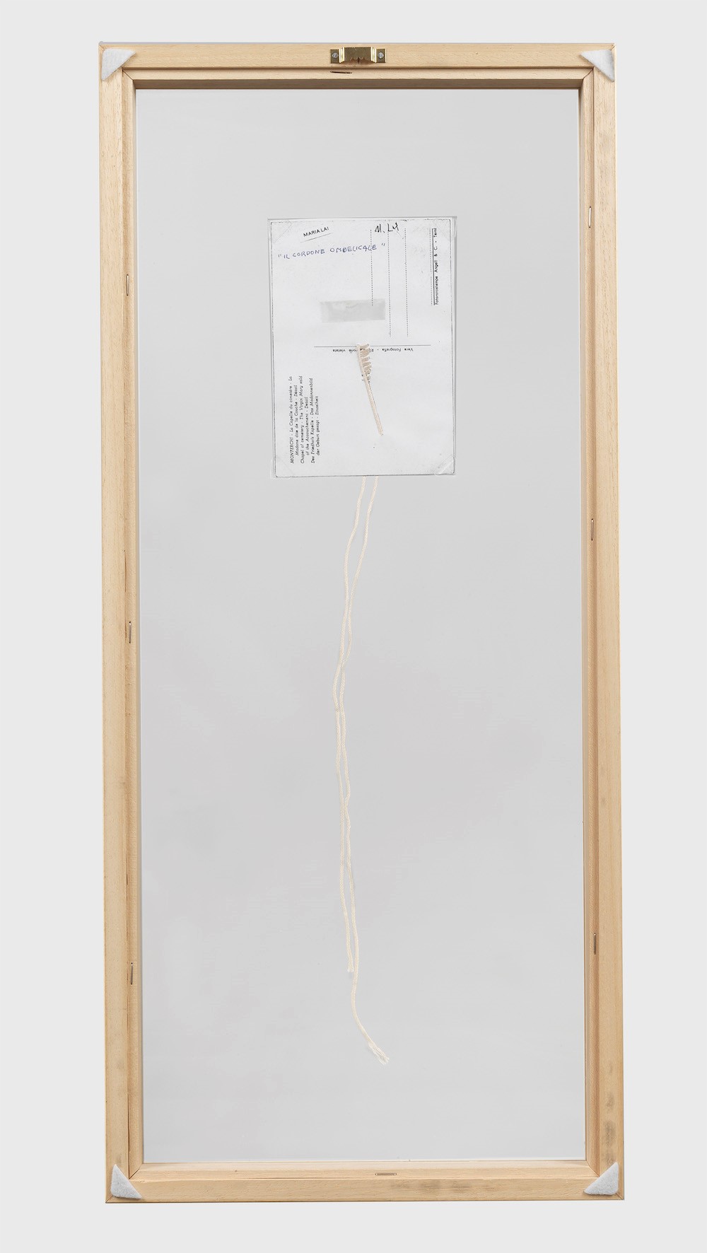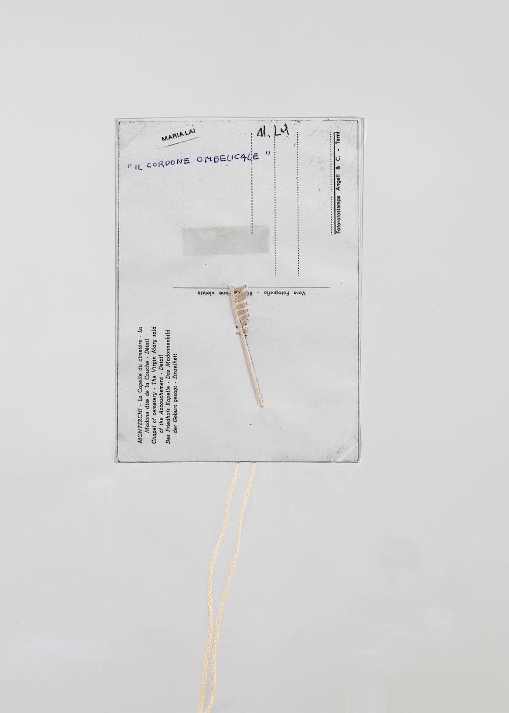 tecnica mista: carta, inchiostro, corda, cm 51x10,5; in cornice (cm 67x30) intitolato al retro Opera registrata presso l’Archivio Maria Lai, Lanusei, in data 30 giugno 2019, con il codice AA 063/19 , Esposizioni: Mostra internazionale di Mail Art, Galleria Images 70 di Mastrogiacomo, Padova