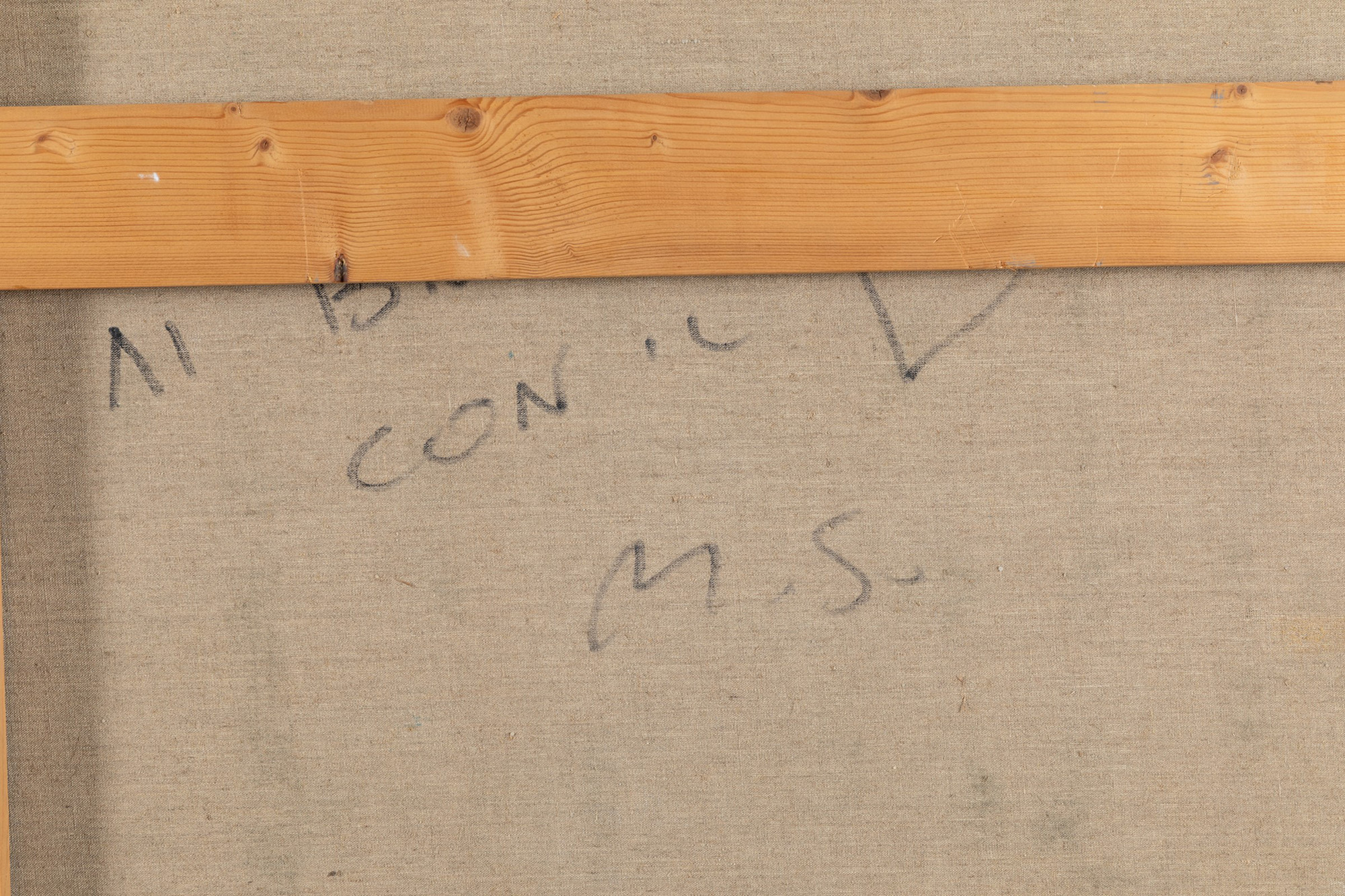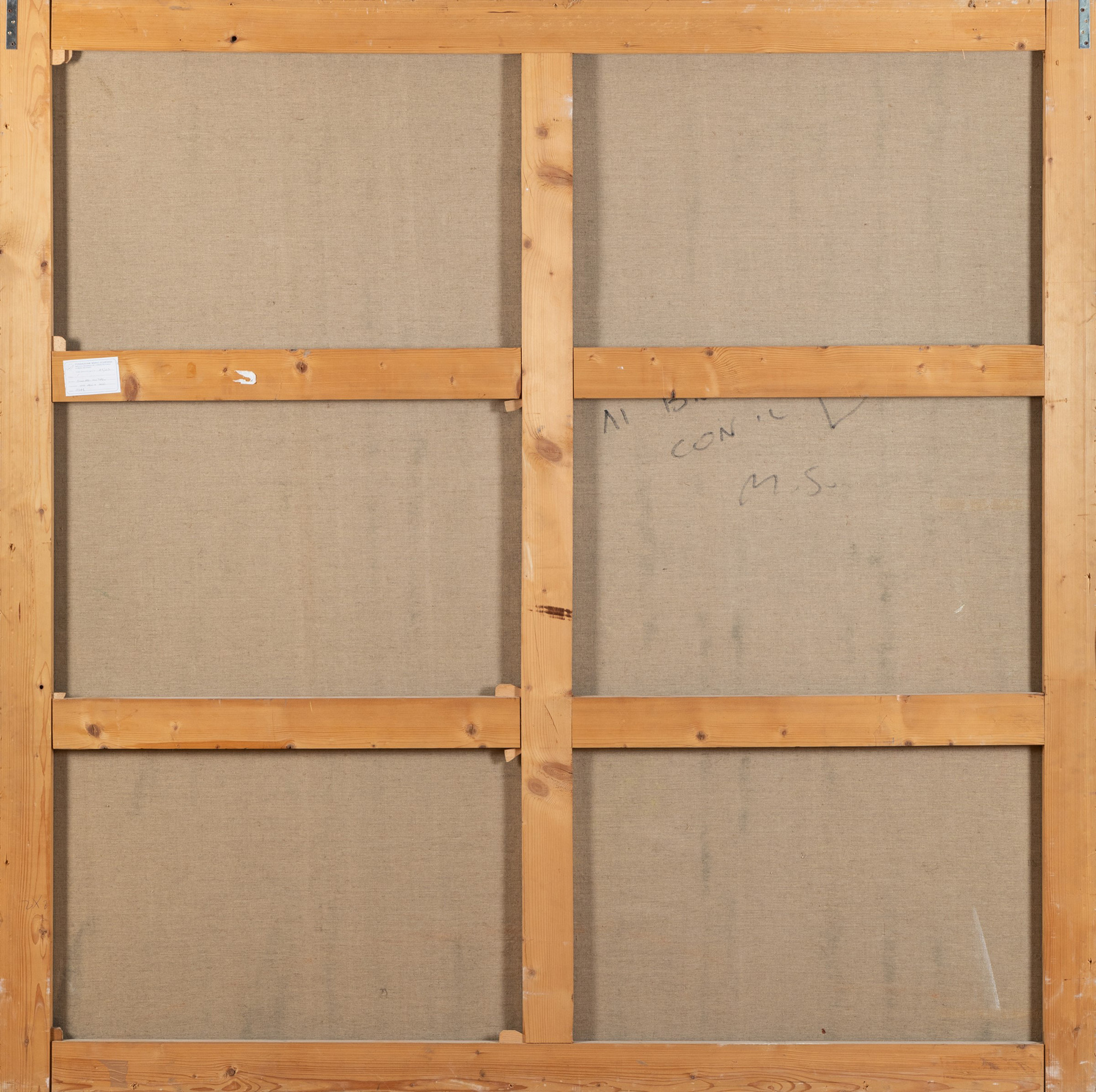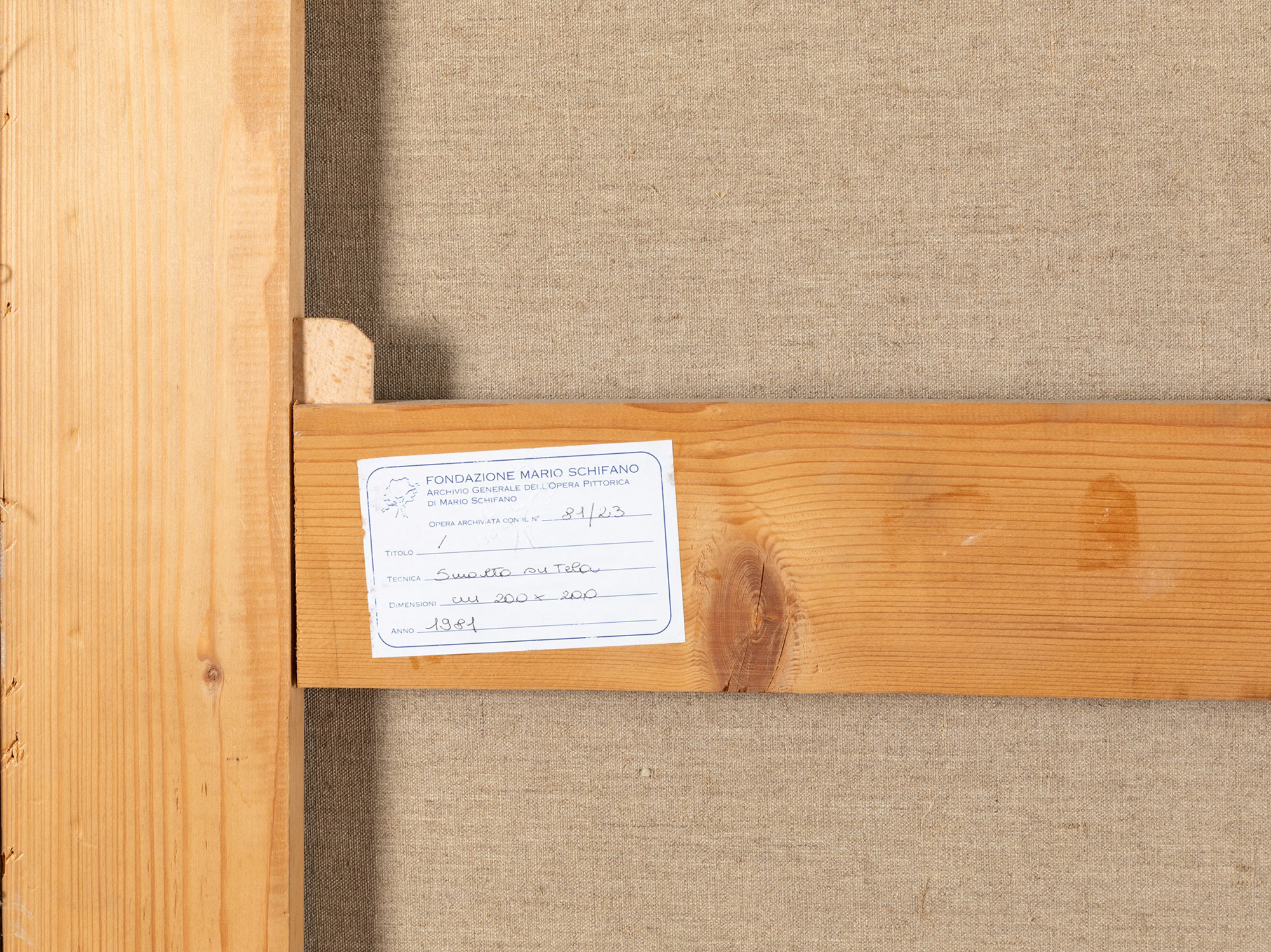 smalto su tela, 200x200 firmato al centro dedicato sotto il telaio Opera registrata presso l'Archivio Mario Schifano, Roma, in data 25 maggio 2020 con il n. 04286200523, Provenienza: Collezione privata, Genova