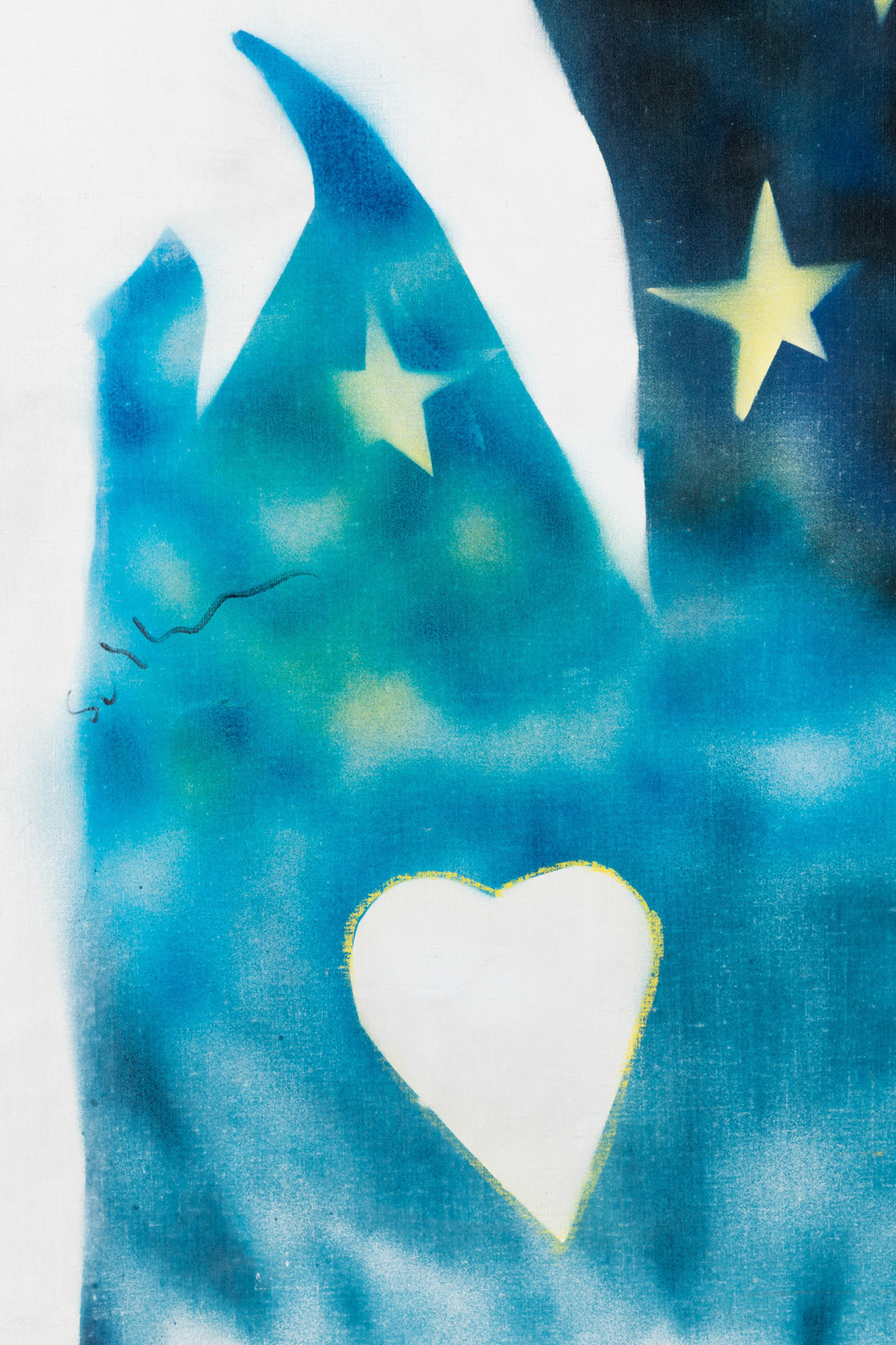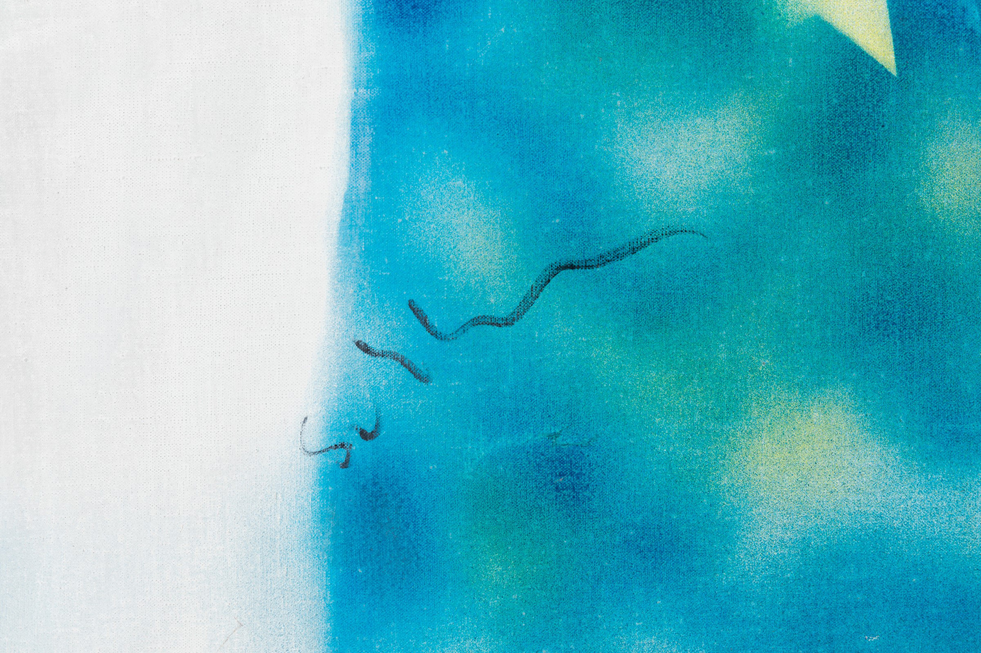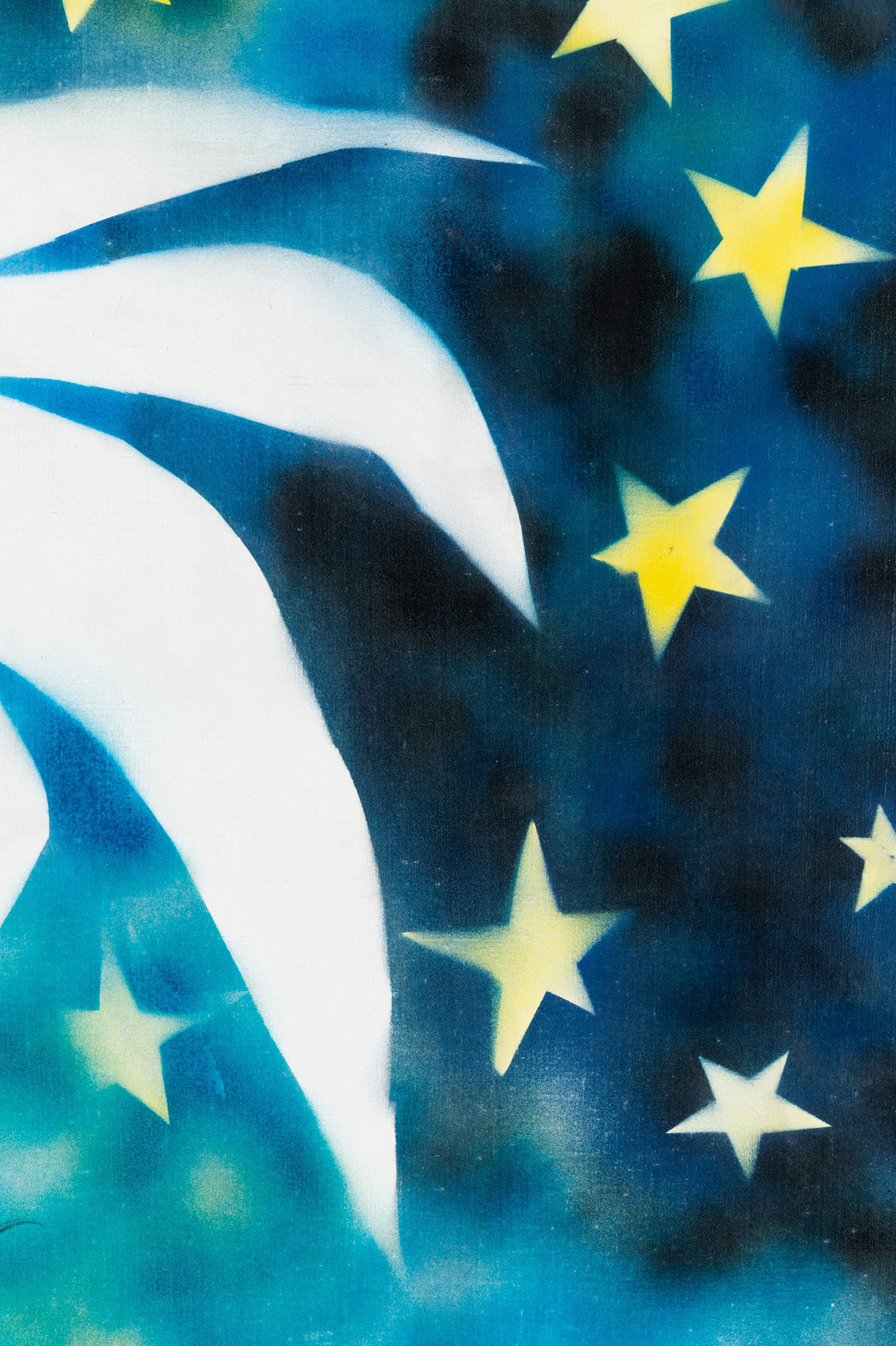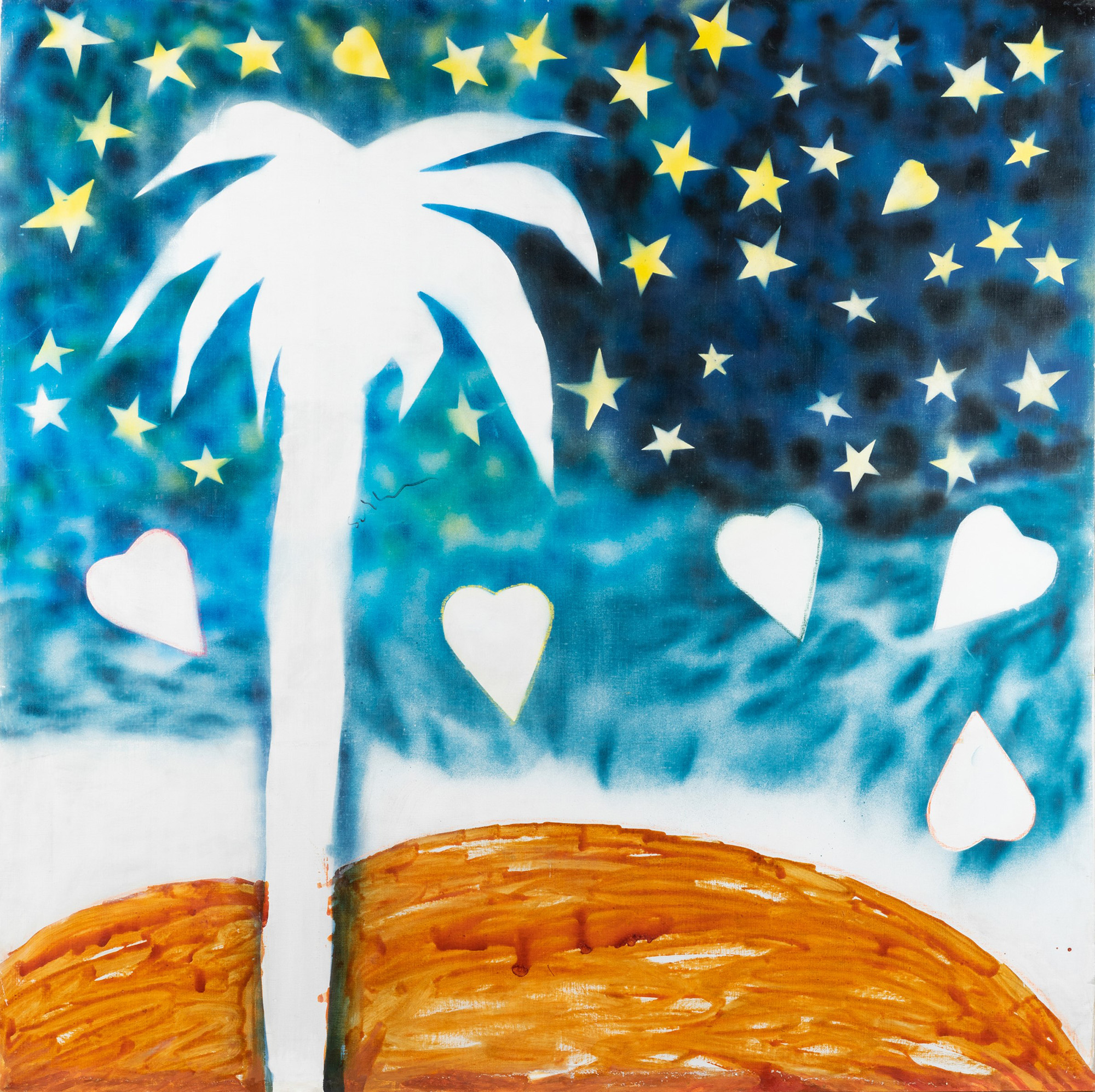 smalto su tela, 200x200 firmato al centro dedicato sotto il telaio Opera registrata presso l'Archivio Mario Schifano, Roma, in data 25 maggio 2020 con il n. 04286200523, Provenienza: Collezione privata, Genova
