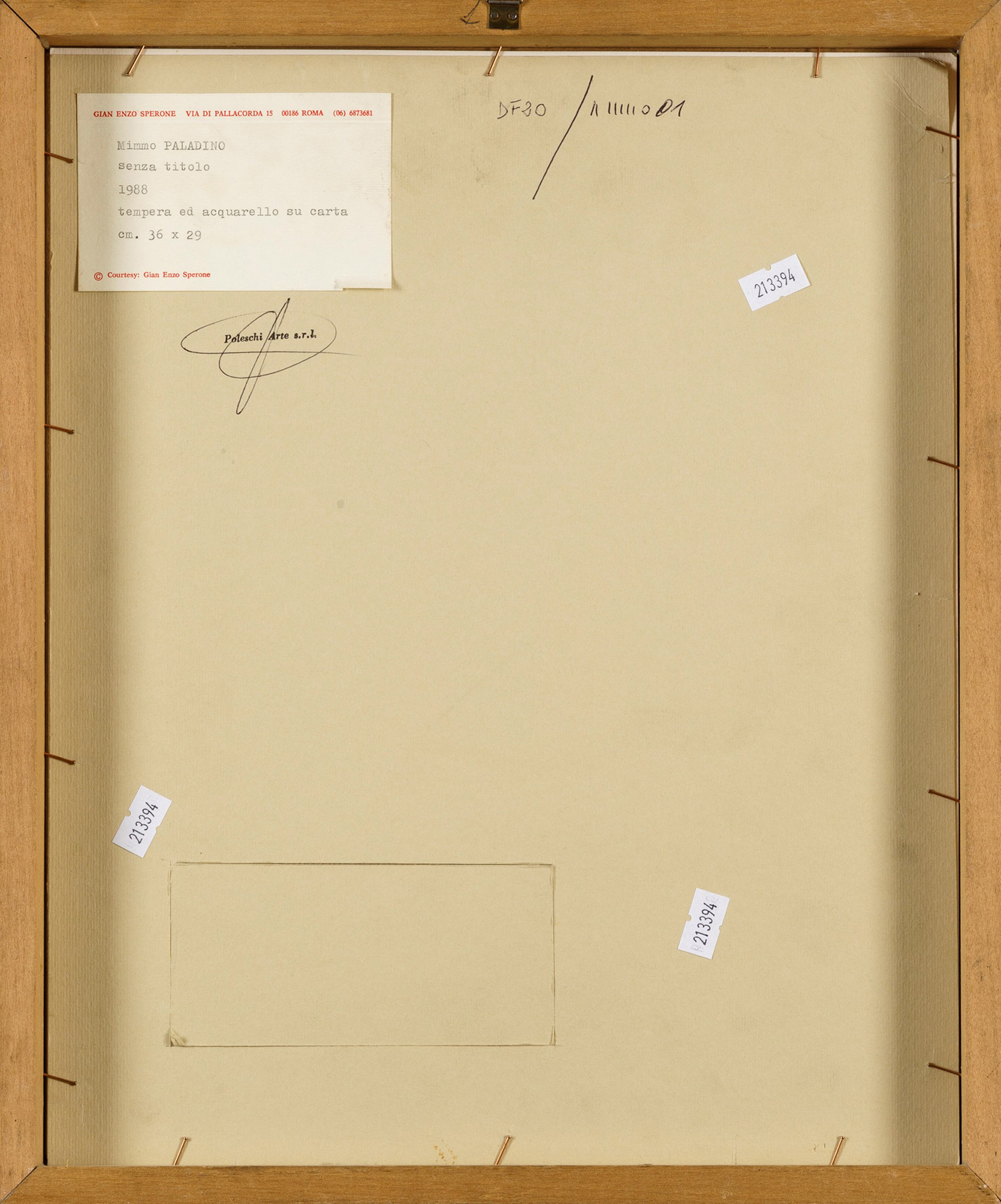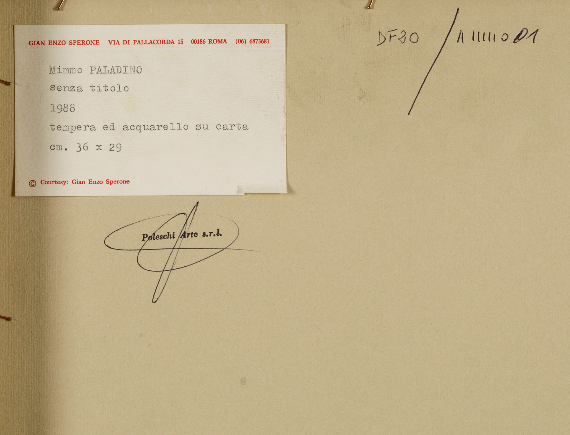 tempera e acquerello su carta, cm 36x29 Etichetta al retro della Galleria Gian Enzo Sperone, Roma Timbro della Poleschi Arte, Milano, Provenienza: Poleschi Arte, Milano Collezione Privata, Milano Esposizioni: Gian Enzo Sperone, Roma, 1988 Poleschi Arte, Milano, 2001