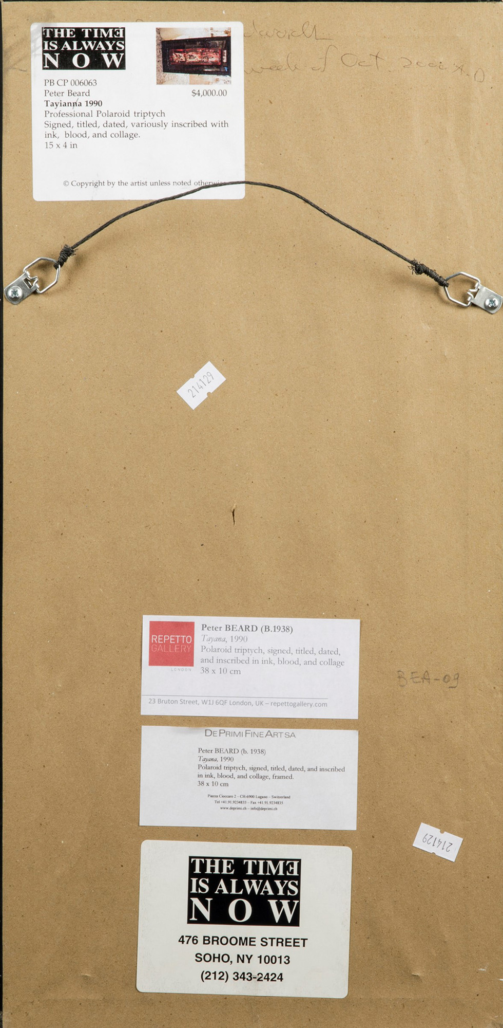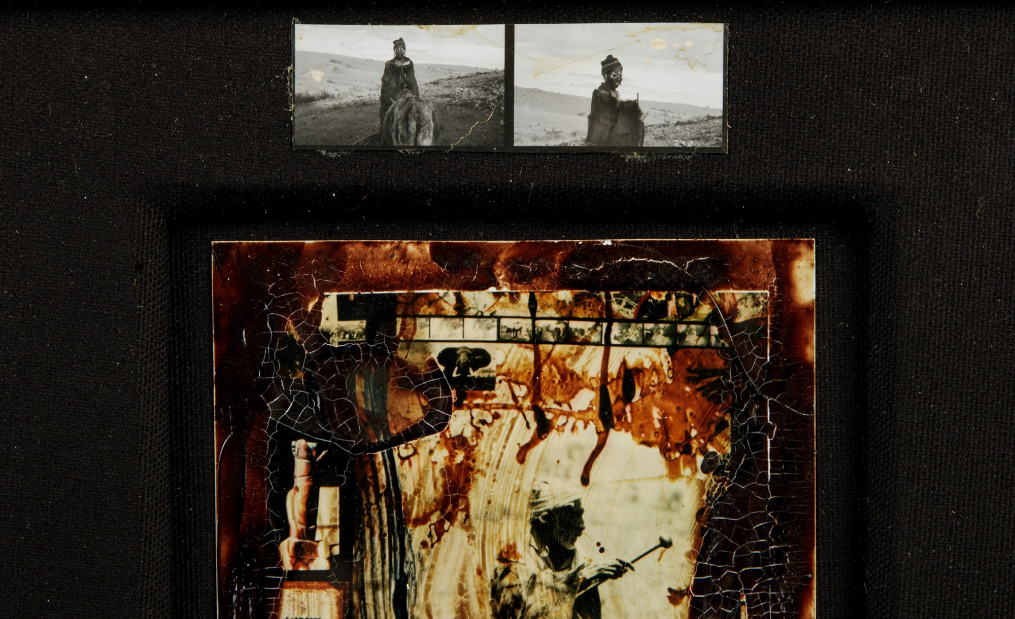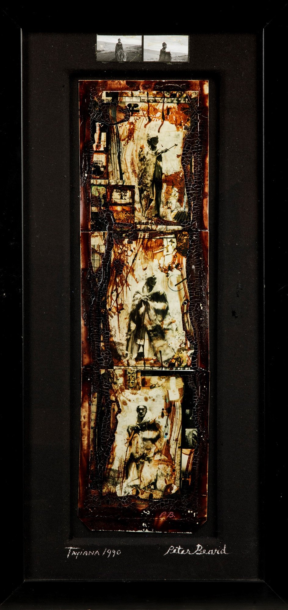 Trittico Polaroid, sangue e collage, fotografia, con cornice cm 38x10Provenienza: The Time is Always Now Gallery, New York. Esposizioni: Overpainting, Repetto Gallery, London, 5th February - 20th March 2015 Bibliografia: Overpainting, Repetto Gallery, London, 5th February - 20th March, 2015, p. XI. firmato, intitolato e datato con incisione a inchiostro in basso al centro Etichetta al retro The Time is Always Now Gallery, New York Autenticità confermata da The Peter Beard Studio., Provenienza: The Time is Always Now Gallery, New York. Esposizioni: Overpainting, Repetto Gallery, London, 5th February - 20th March 2015 Bibliografia: Overpainting, Repetto Gallery, London, 5th February - 20th March, 2015, p. XI.