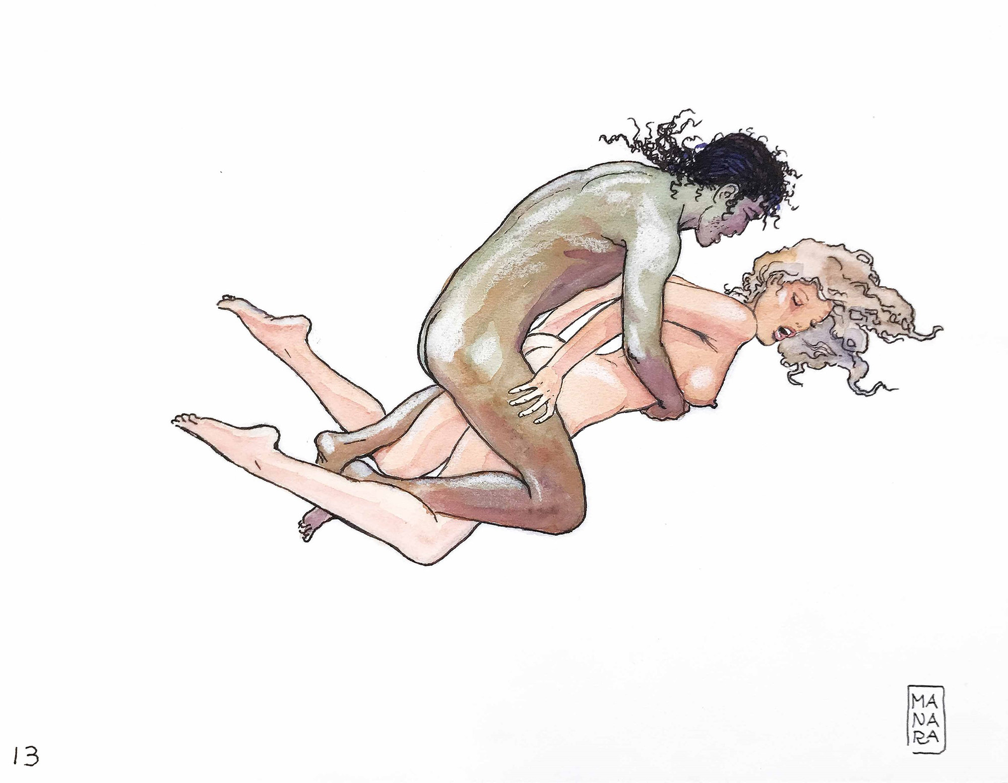 13° illustrazione per l’adattamento del Maestro Manara dall’antica opera indiana sulle arti amatorie. Edita in Italia da Mondadori nel 1998. Tecnica mista su cartoncino. Cm 24x31. Firmata in cartiglio. Ottimo stato.