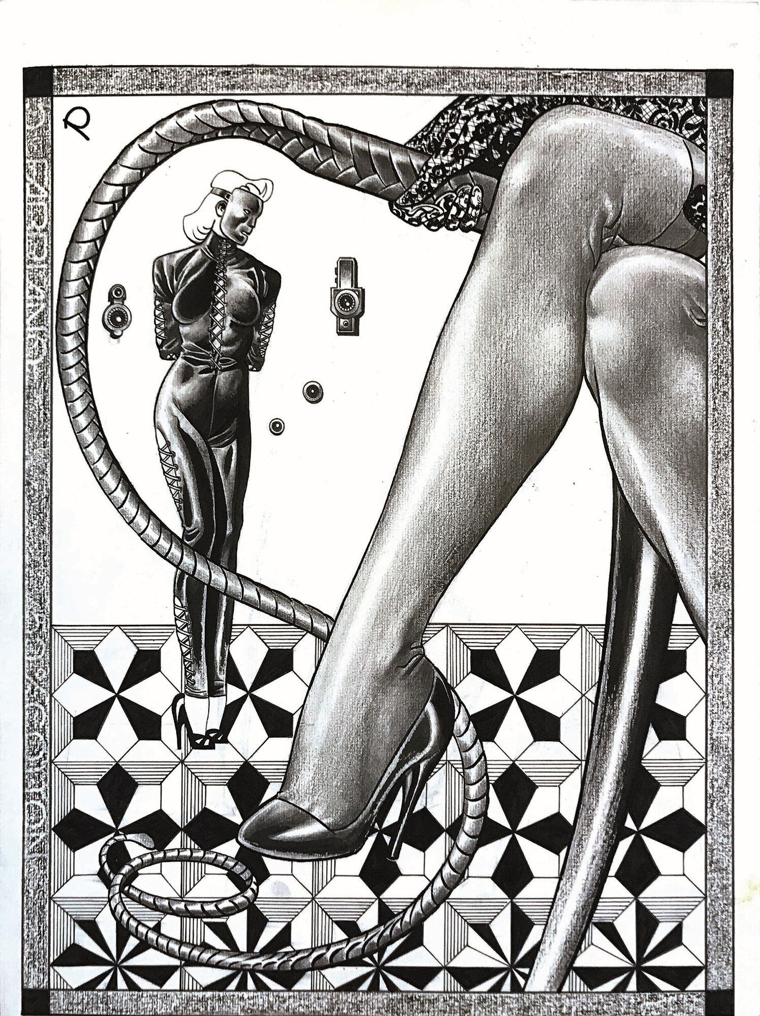 Illustrazione per rivista erotica. Matita, china e carboncino su cartone. Cm 39x29,5. Non datata ma 1985. Buono stato.