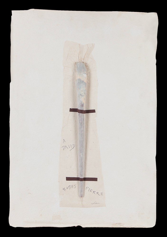 ERNESTO TATAFIORE Marigliano 1943  A David Robes Pierre, (1989) tecnica mista e applicazioni su carta a mano cm. 57x38,5; firma in basso al centro, etichetta della Galleria Levy (Amburgo) al retro.