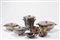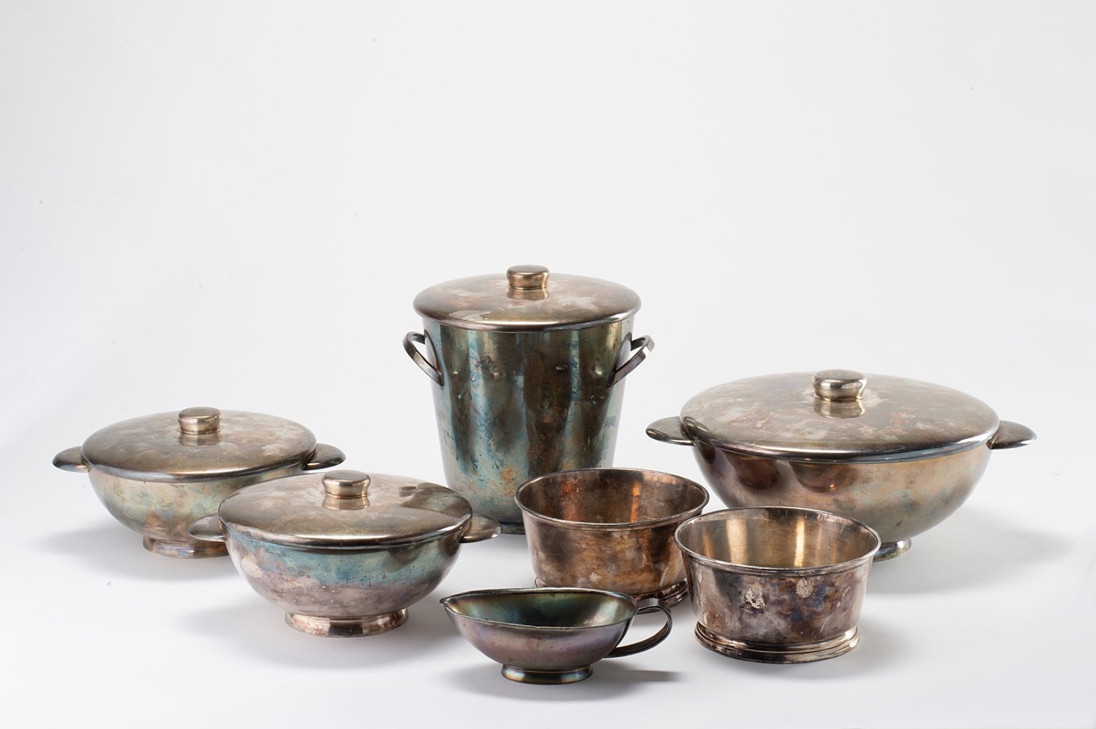 composto da 3 contenitori per consommé, una legumiera, due ciotole e una salsiera in metallo argentato e firmati sotto la base.