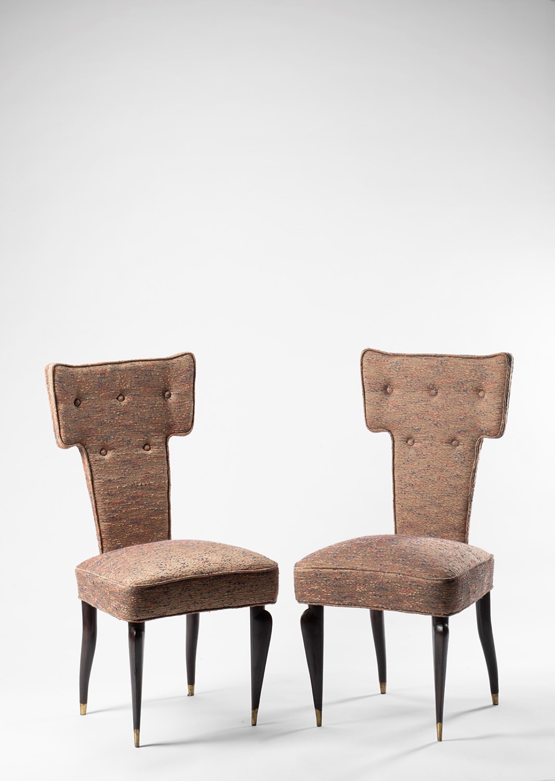 L'attuale coppia di poltrone, progettata dall'architetto mantovano Renzo Zavanella, sintetizza la sua sperimentazione con nuove forme tecniche e la sua affinità per l'artigianato tradizionale. Zavanella, che ha iniziato la sua carriera lavorando nello studio di Gio Ponti ed Emilio Lancia, ha progettato opere uniche per ciascuno dei suoi progetti,caratterizzati dalla sua ricerca di forme espressive e una qualità scultorea tridimensionaleimbottite con gambe in legno e puntali in ottone