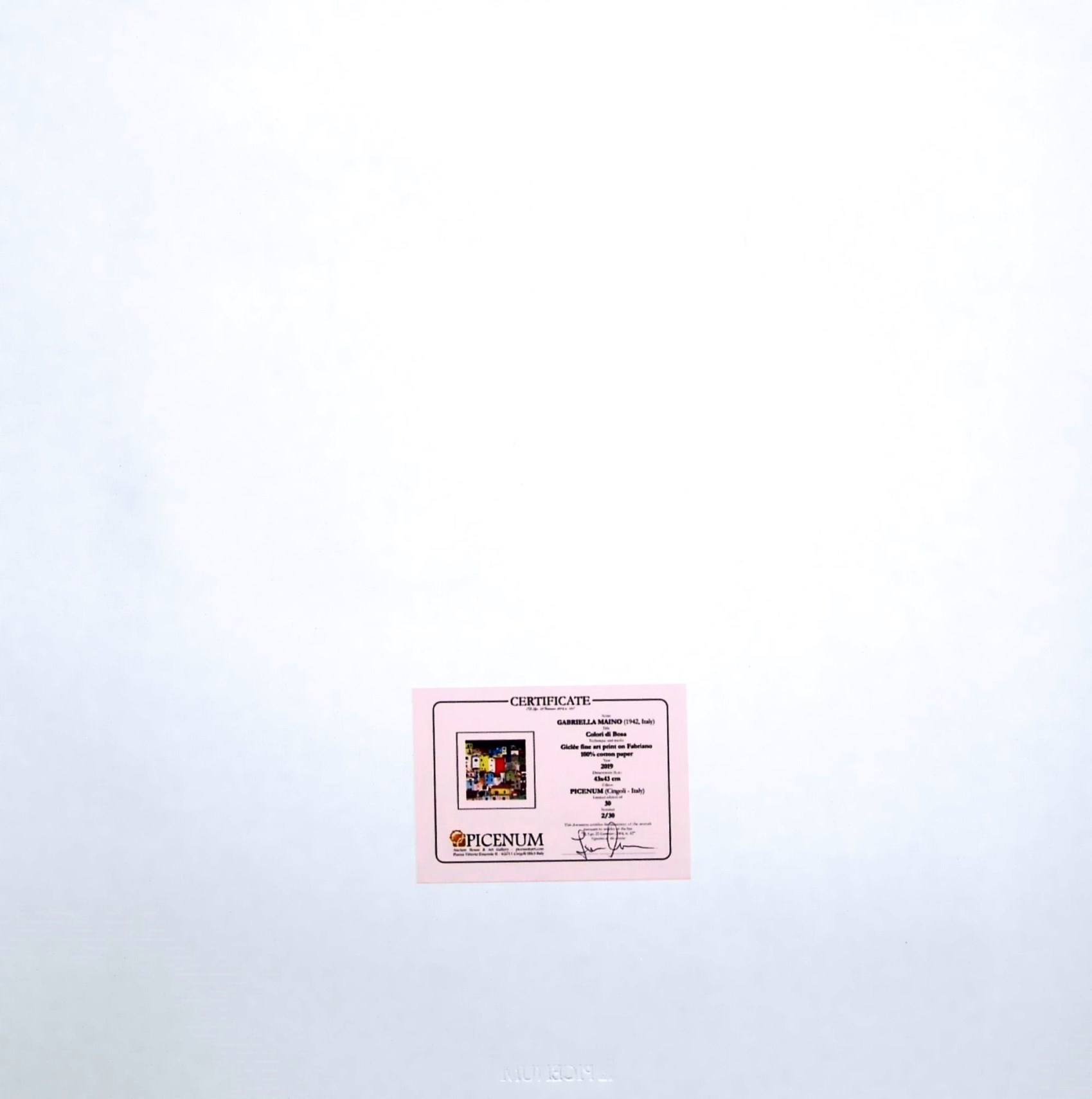certificato di autenticità e timbro a secco dell'editore Picenum