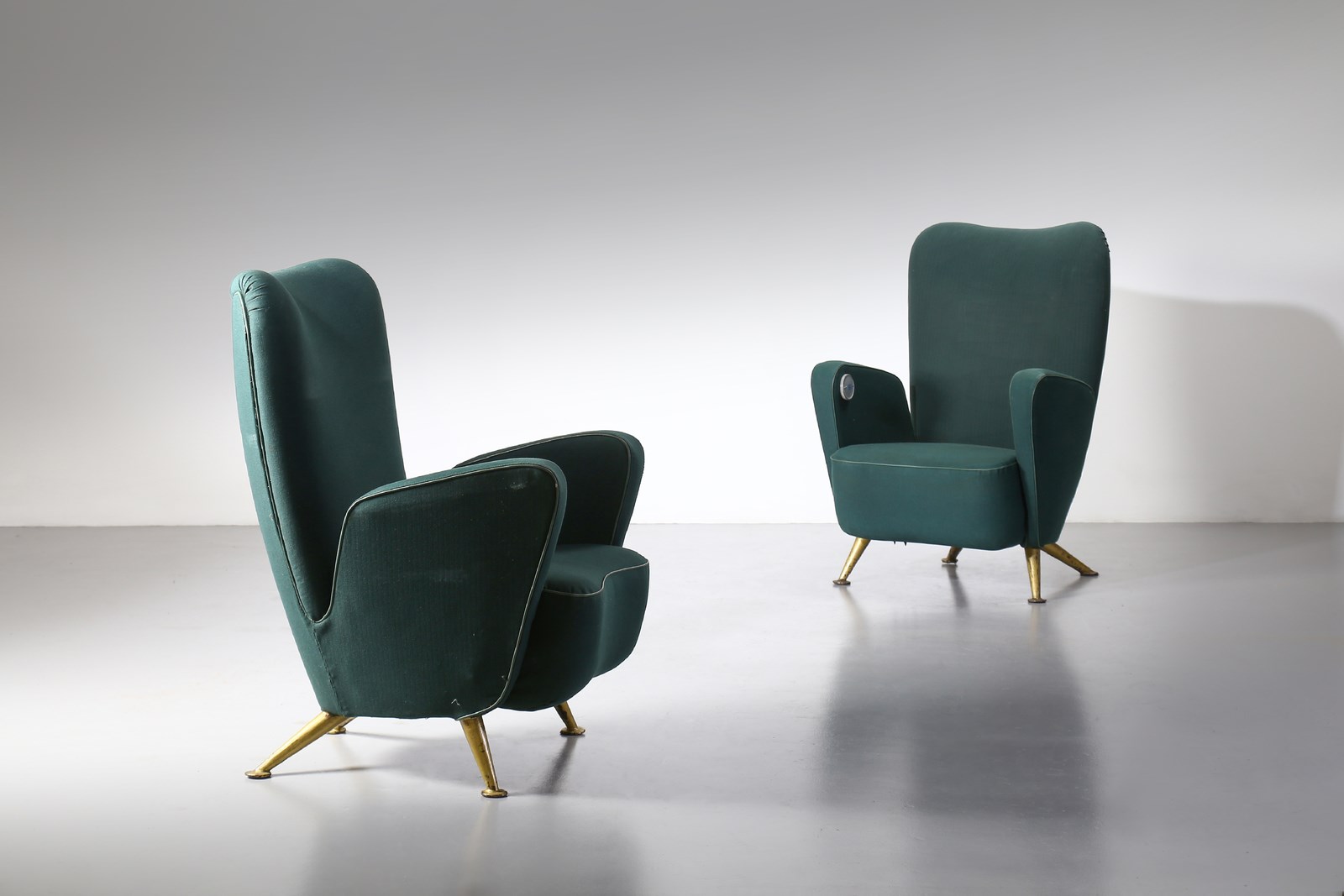 MINOLETTI GIULIO (1910 - 1981) Coppia di poltrone, per ATR300 Settebello Officine Breda, anni '50. (2). Metallo dorato e tessuto. Cm 66,00 x 99,00 x 67,00. Pubblicazioni; Aloi R., Mobili tipo, Ulrico Hoepli, 1956, p.2