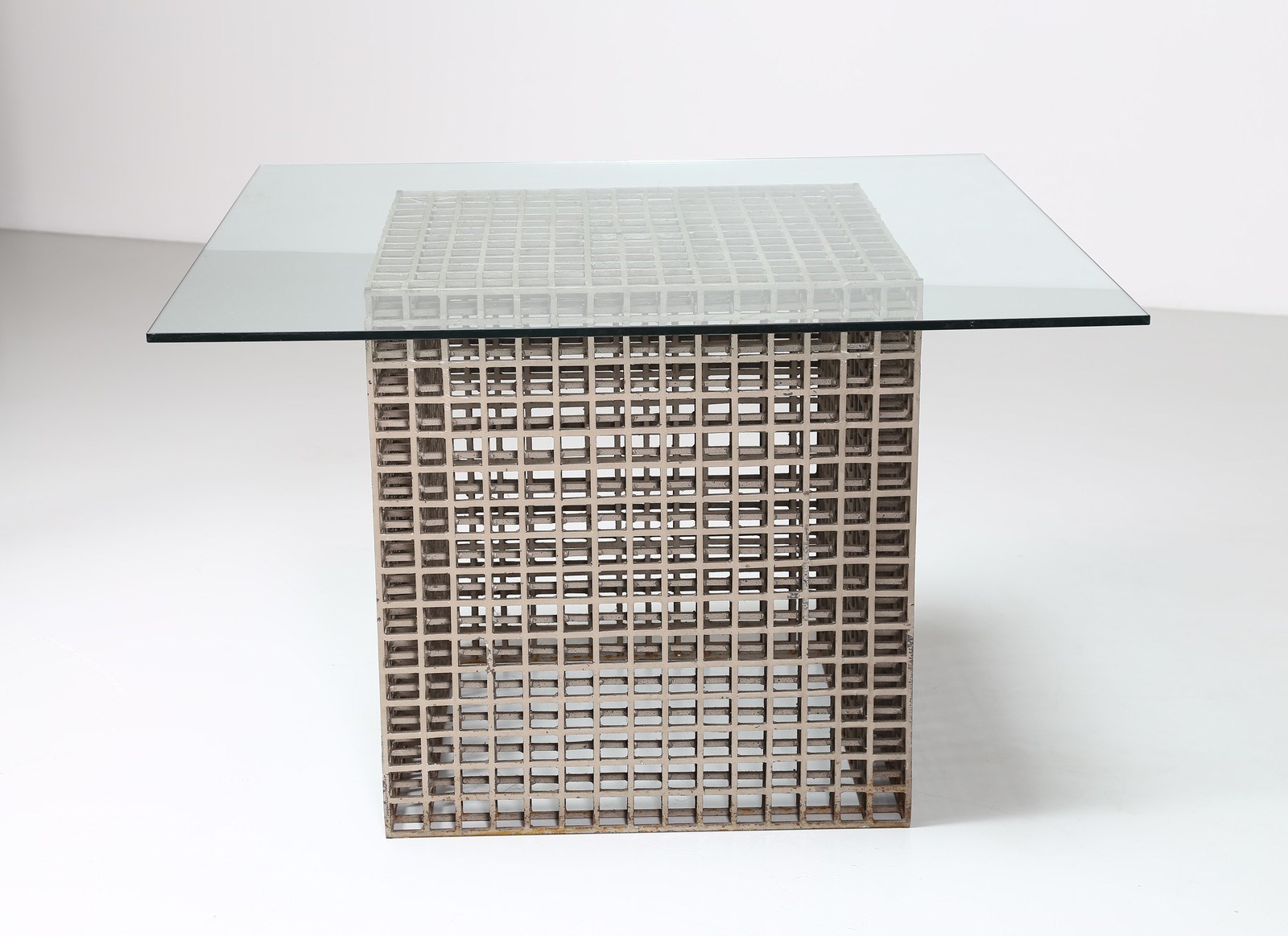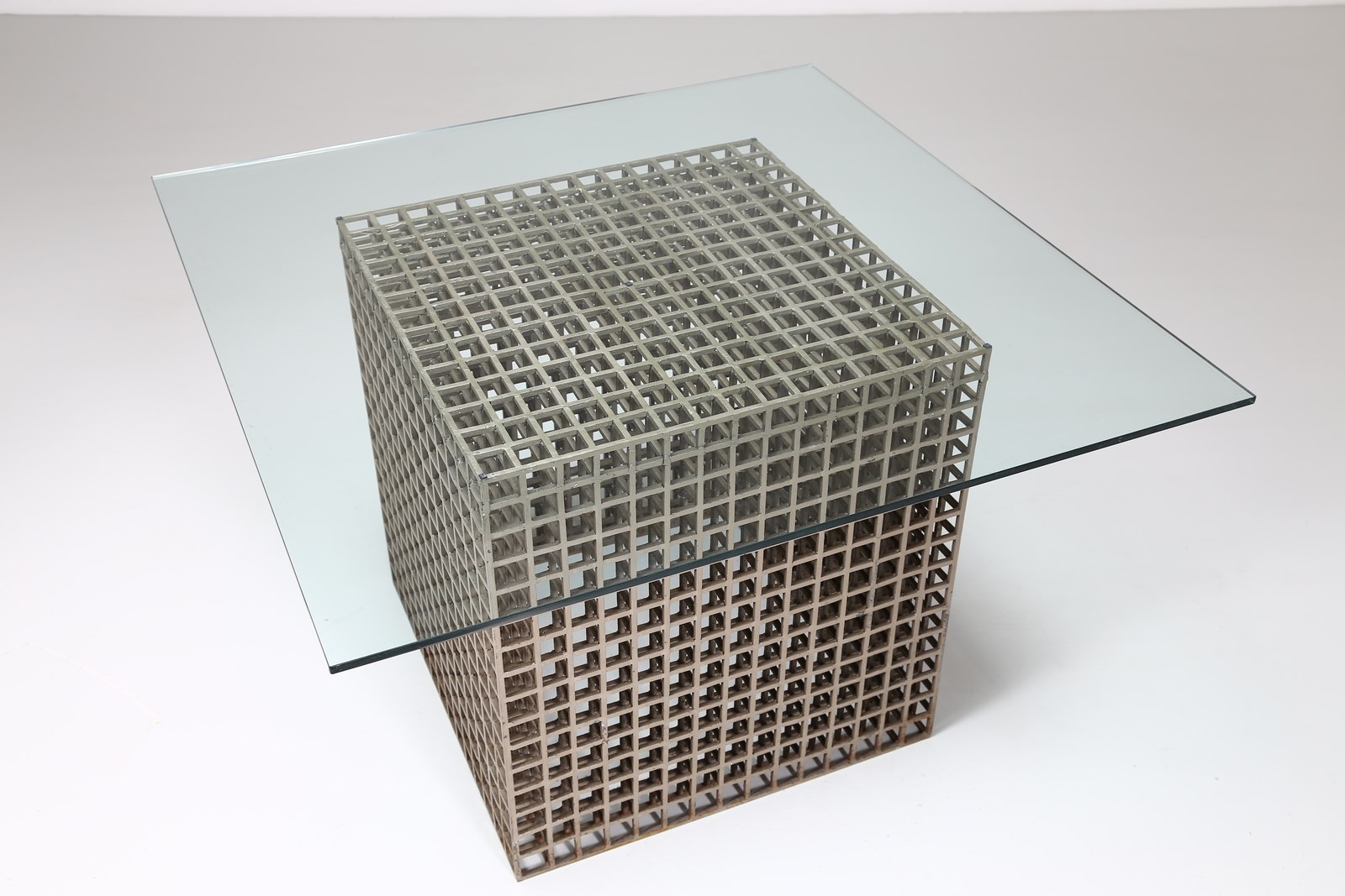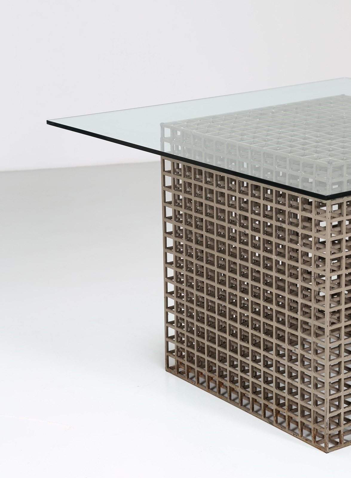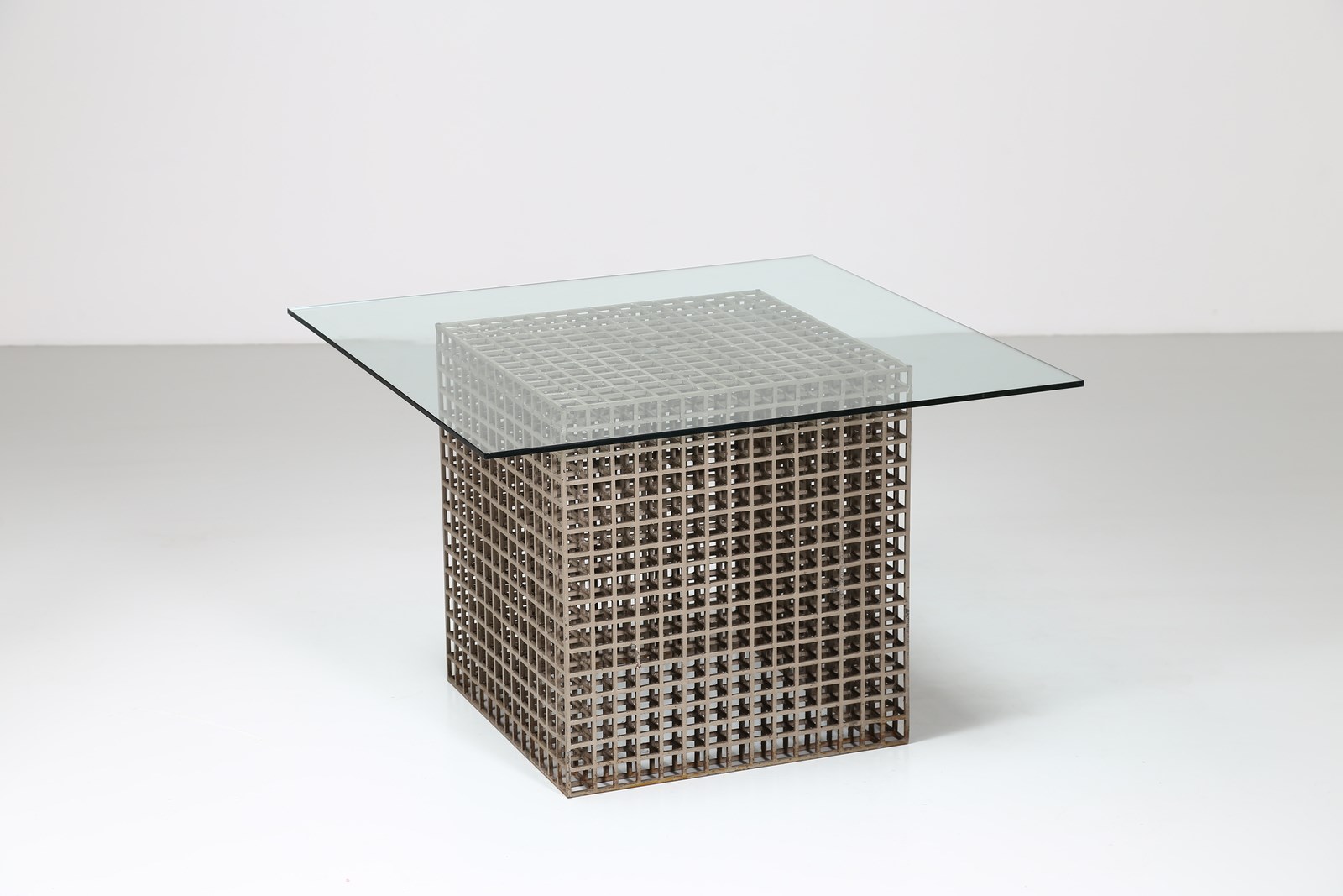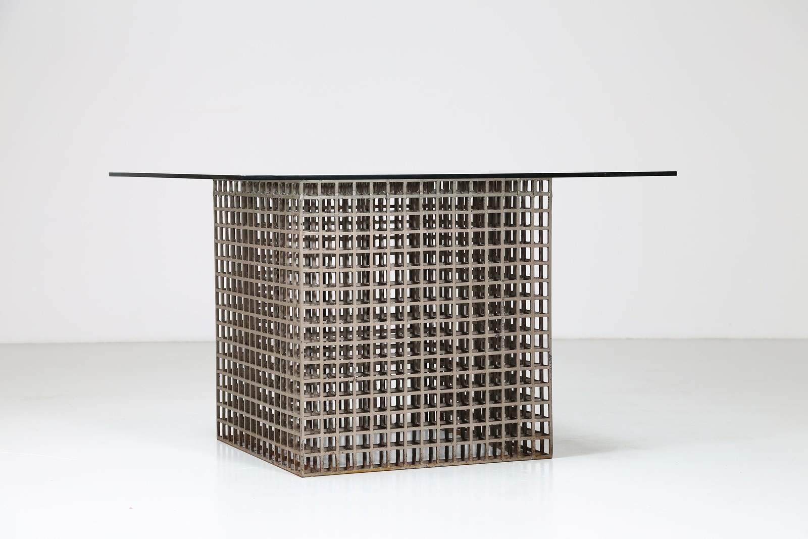 SOZZANI CARLA (n. 1947) Tavolo anni '80. Metallo e vetro.. Cm 120,00 x 77,00 x 120,00. Provenienza: Boutique, via Margutta, Roma.