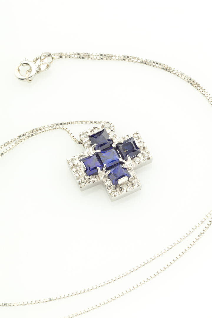 in oro bianco, a forma di croce con zaffri sintetici taglio princess e diamanti taglio brillante per totali ct 0,15 ca