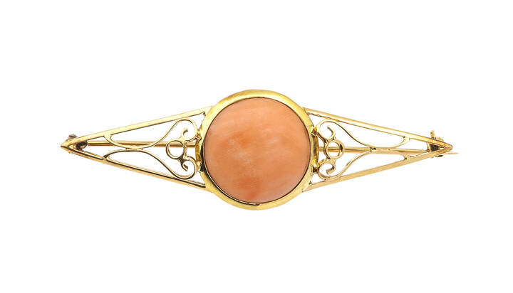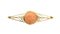 in oro giallo, di forma geometrica, al centro semisfera cabochon di corallo giapponese di colore rosa