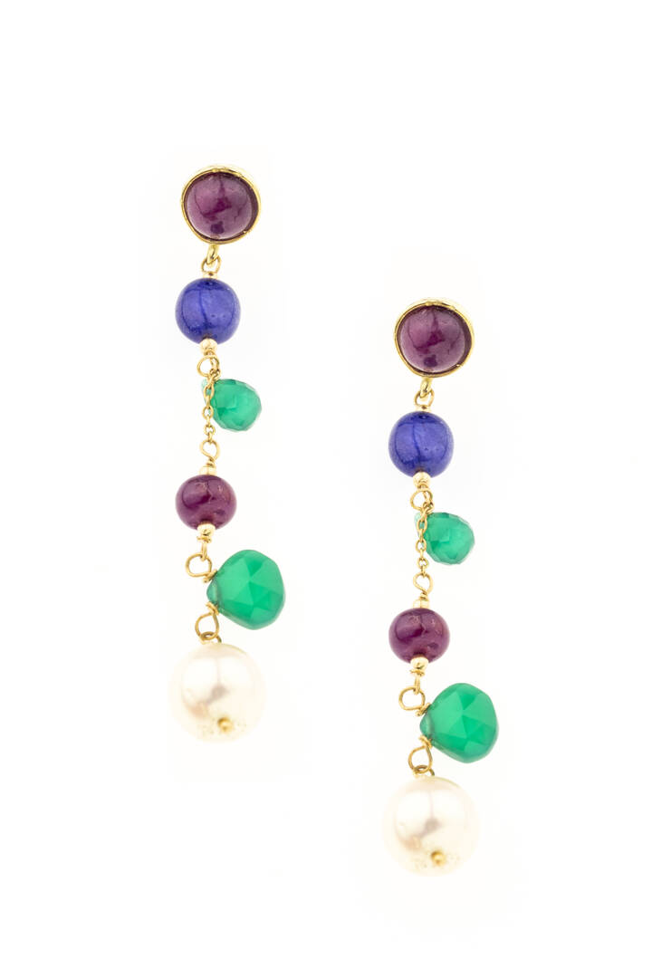 in oro giallo con sfere ovalizzate di zaffiri, pietre verdi taglio a goccia briolette, rubini cabochon e due perle di acqua dolce pendenti