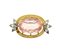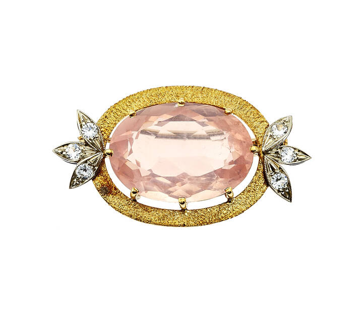 in oro giallo satinato e bianco, di forma ovale, con grande quarzo rosa sintetico e piccoli zaffiri bianchi sintetici